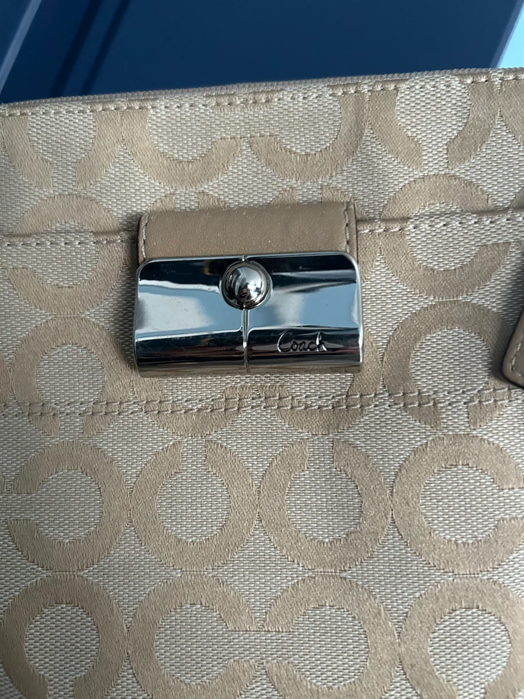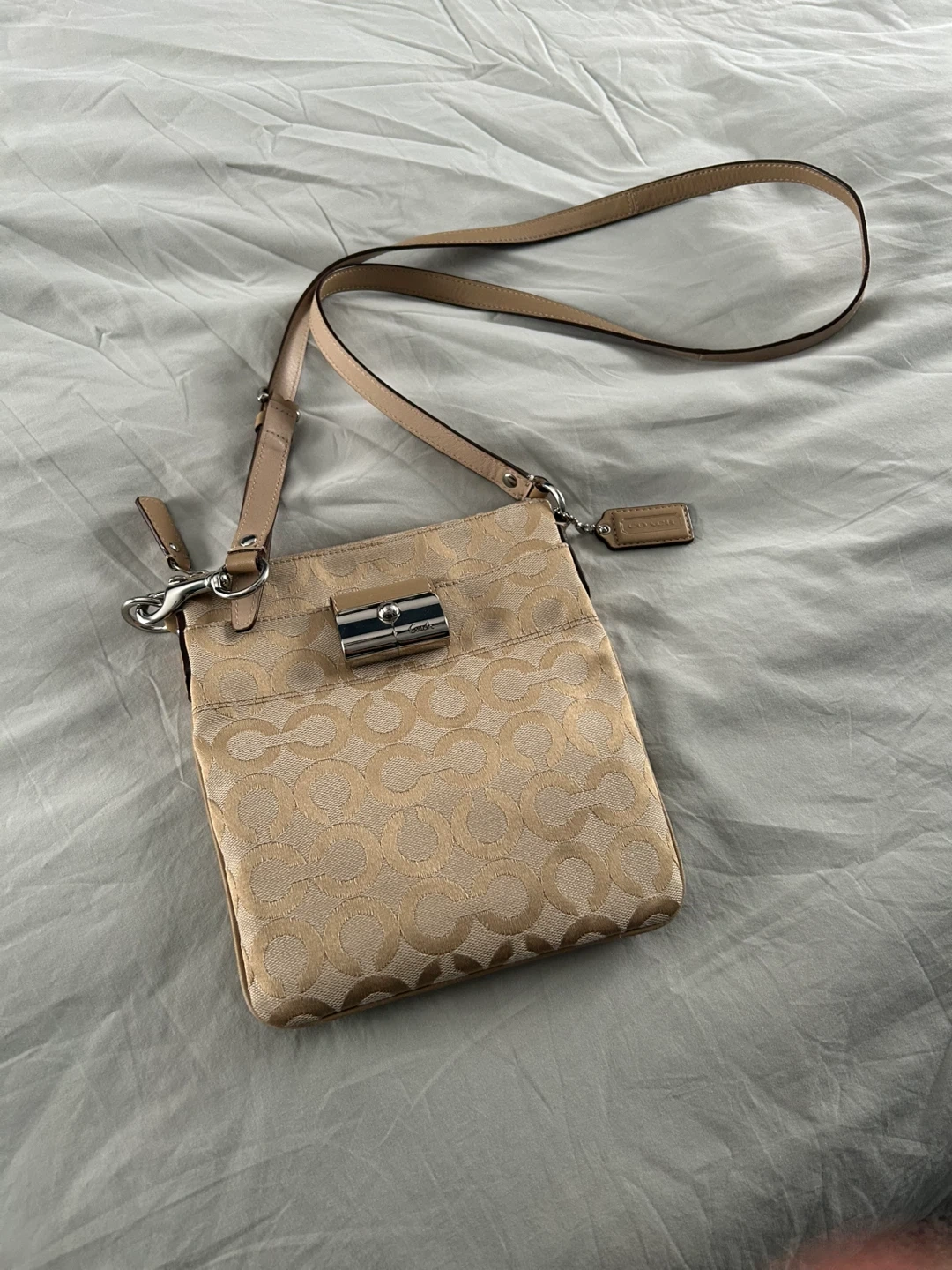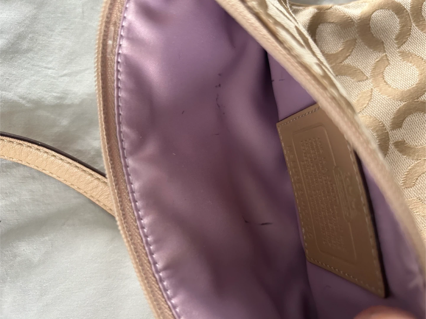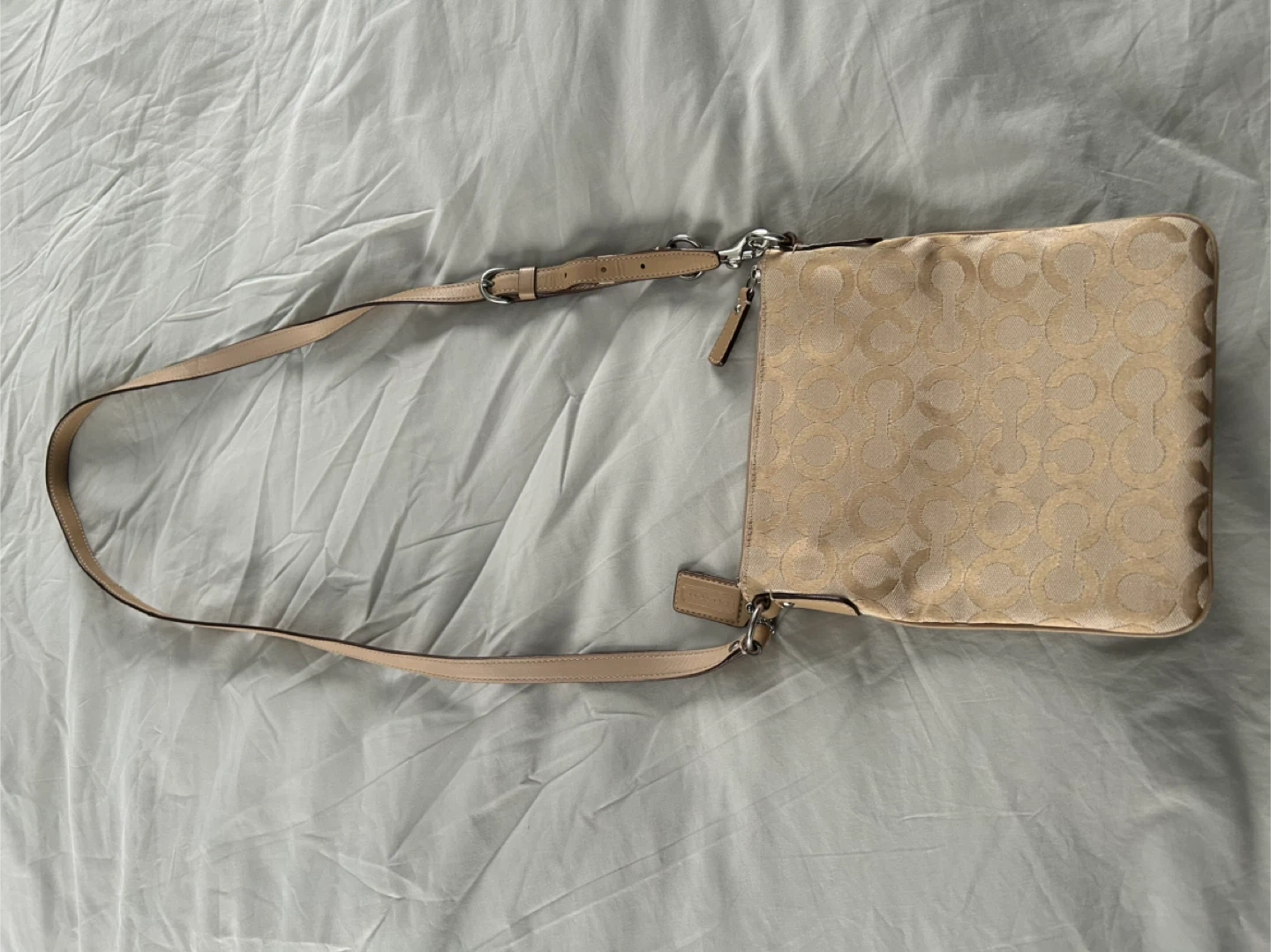 Selling a cute Coach crossbody bag! It's in great condition and perfect for carrying your essentials. The bag features the classic Coach logo pattern in beige. The interior is a light purple colour. It has a convenient crossbody strap for easy, hands-free wear.Has couple small pen marks on inside lining