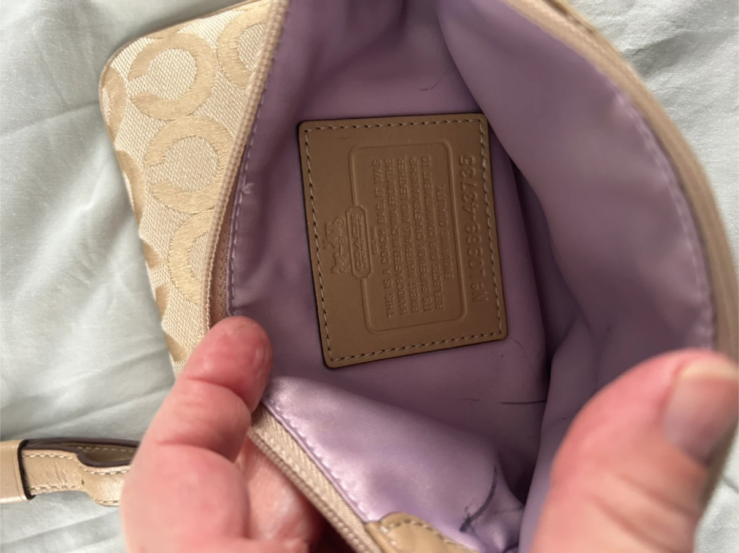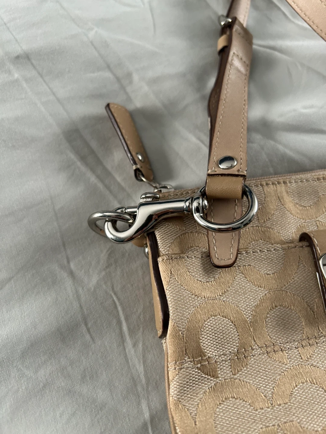 Selling a cute Coach crossbody bag! It's in great condition and perfect for carrying your essentials. The bag features the classic Coach logo pattern in beige. The interior is a light purple colour. It has a convenient crossbody strap for easy, hands-free wear.Has couple small pen marks on inside lining
