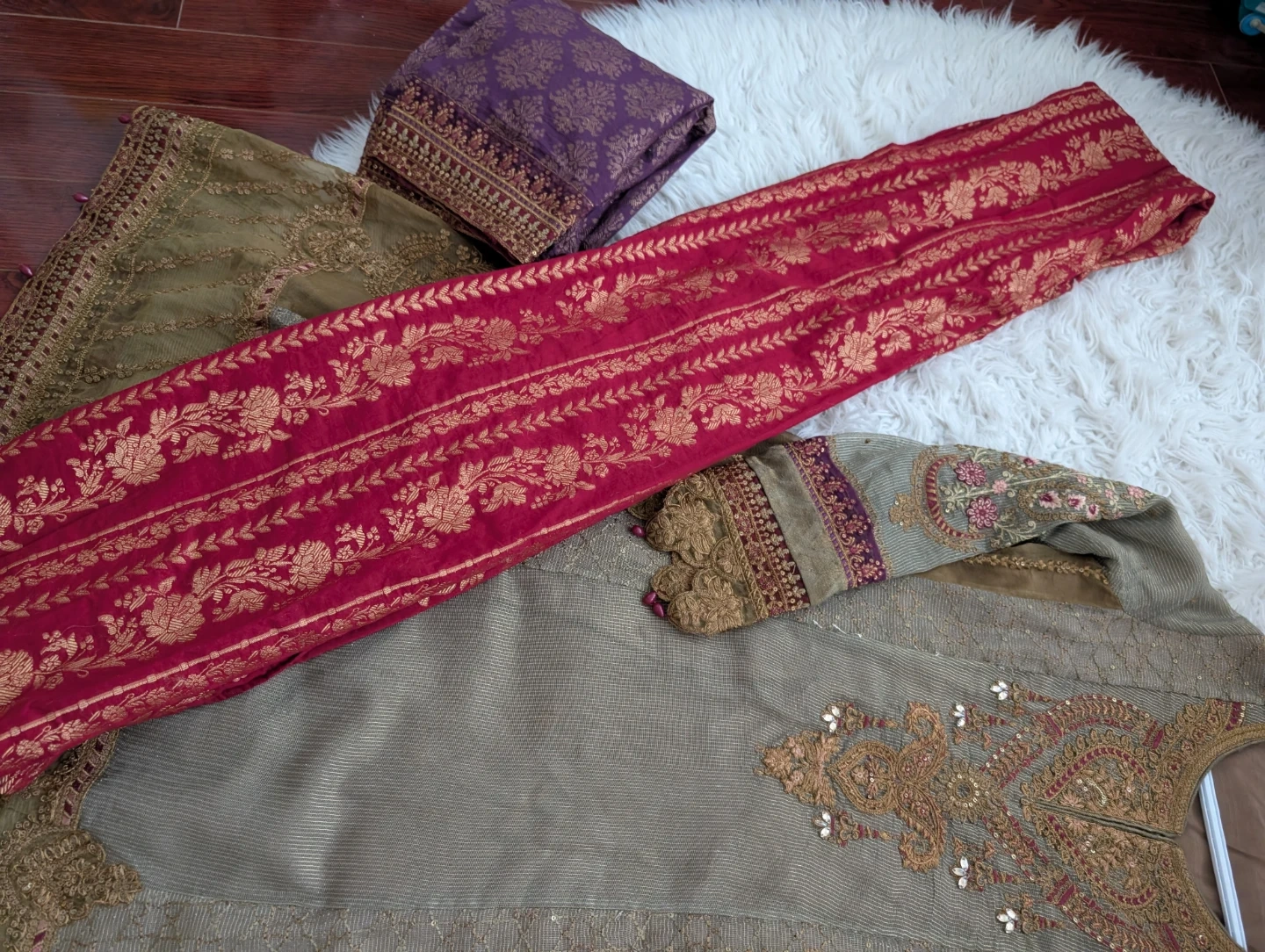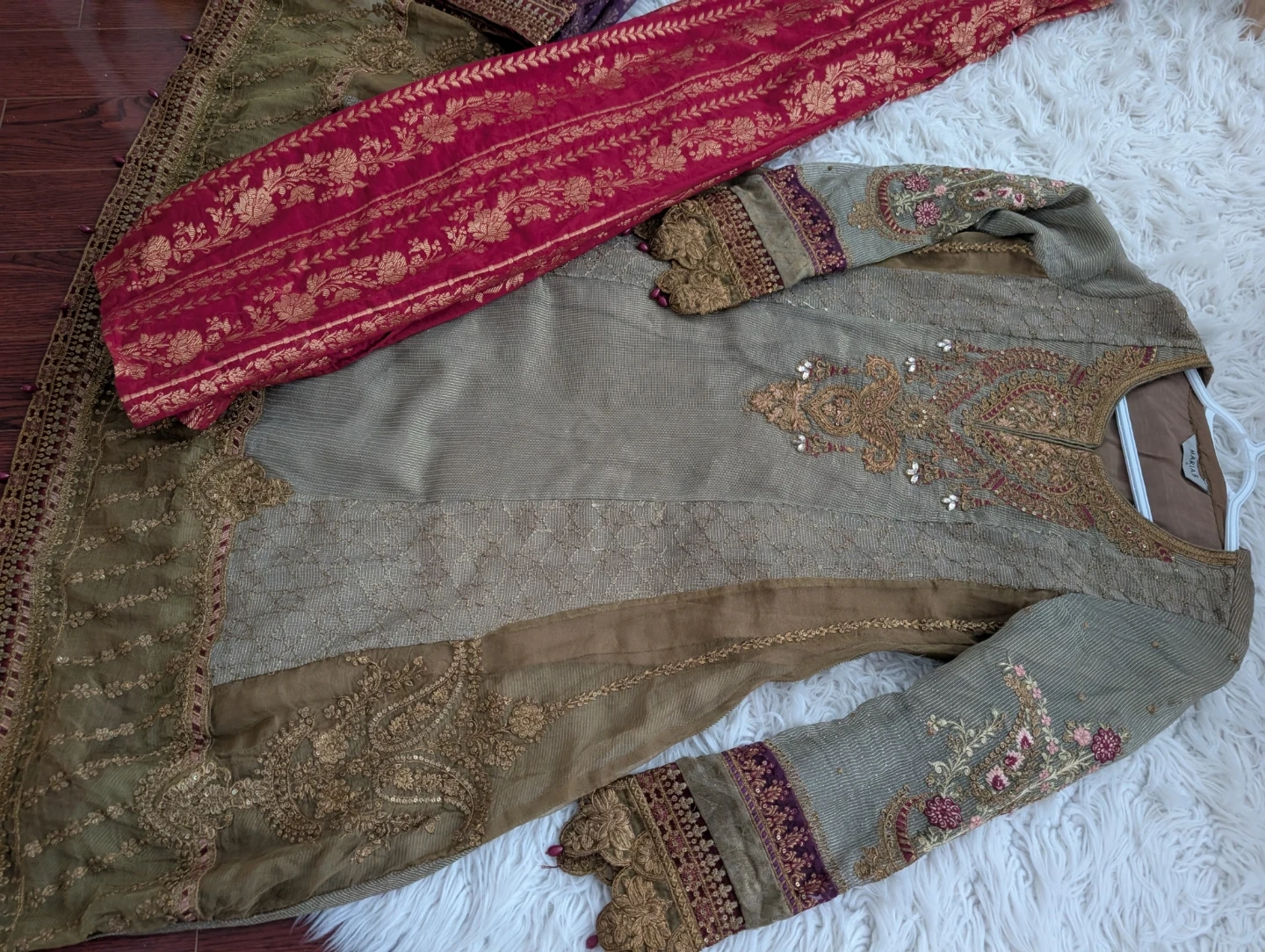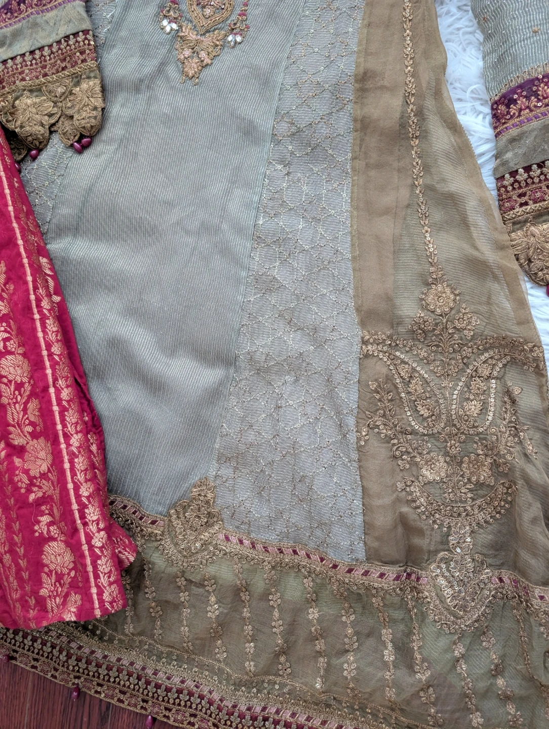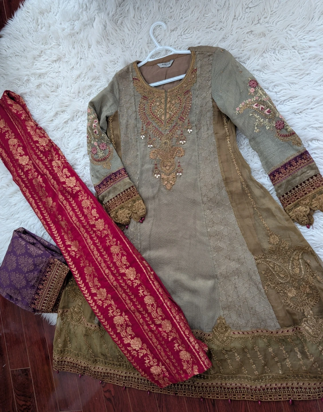 This is a Maria B. embroidered dress. It features intricate embroidery. It comes with a coordinating red and gold embroidered dupatta and a purple embroidered shalwar. This outfit is perfect for formal occasions!