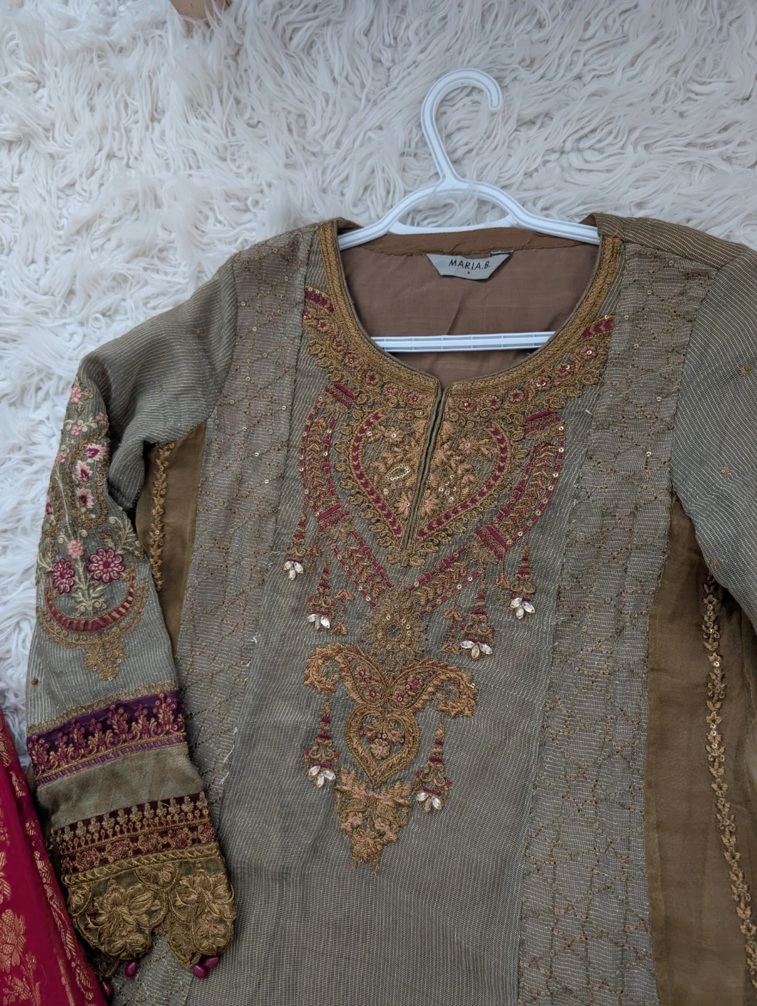 This is a Maria B. embroidered dress. It features intricate embroidery. It comes with a coordinating red and gold embroidered dupatta and a purple embroidered shalwar. This outfit is perfect for formal occasions!