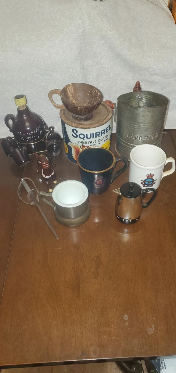 A collection of vintage items including a gold-tone cigarette case, a silver-tone lighter, and several decorative ashtrays. It also includes a variety of mugs, a tin of Squirrel peanut butter, and other small decorative pieces. These items would appeal to collectors of retro or antique homeware.