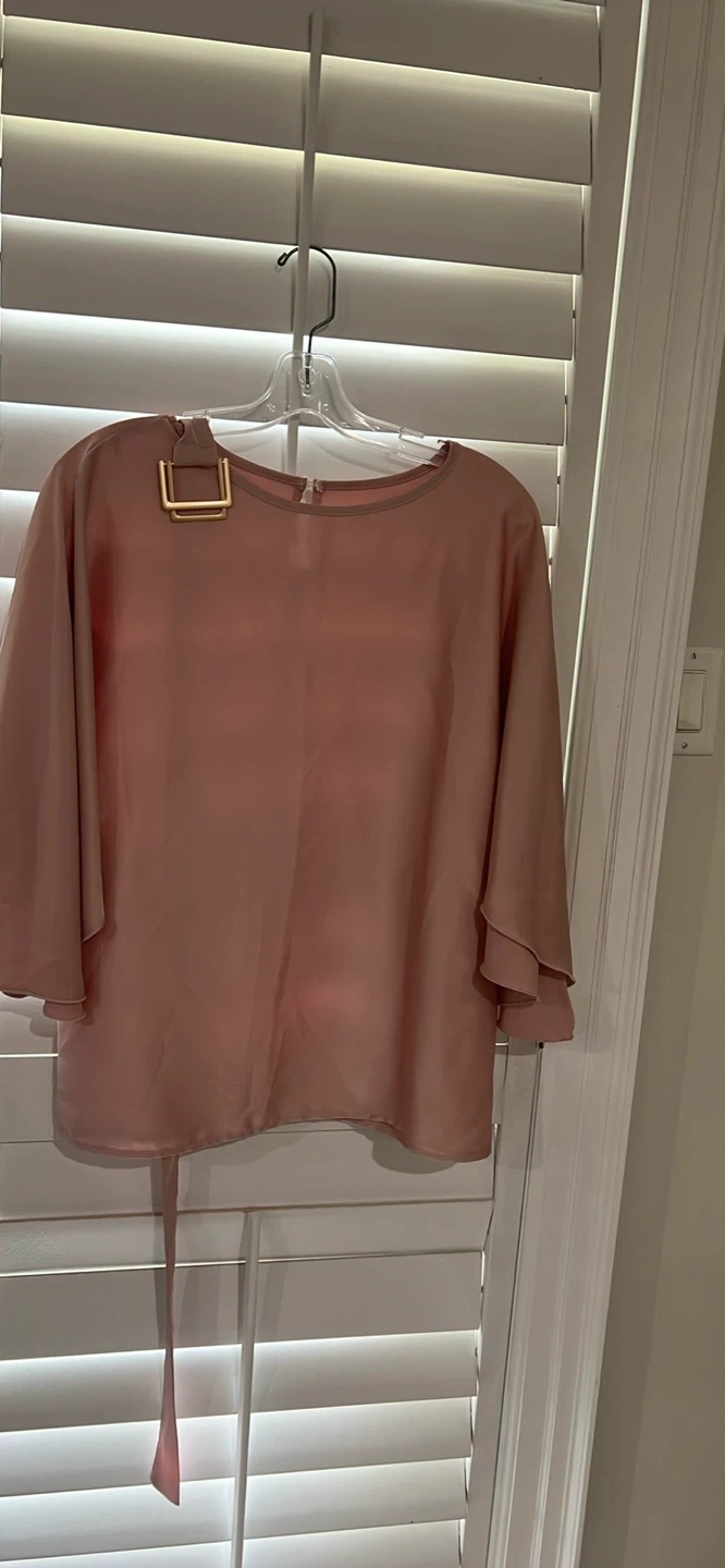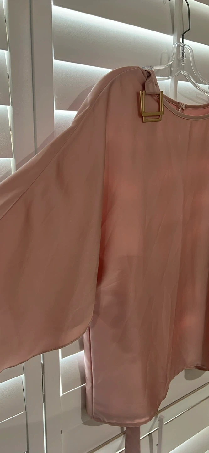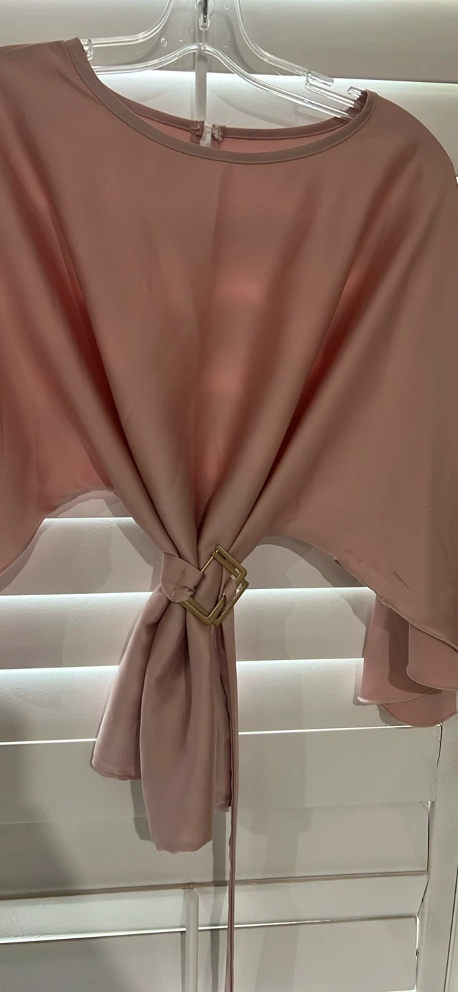 A lovely blush pink blouse with elegant wide sleeves and a gold-tone square buckle detail at the neckline. It features a tie waist for an adjustable fit. This top's flowy material makes it super comfy!