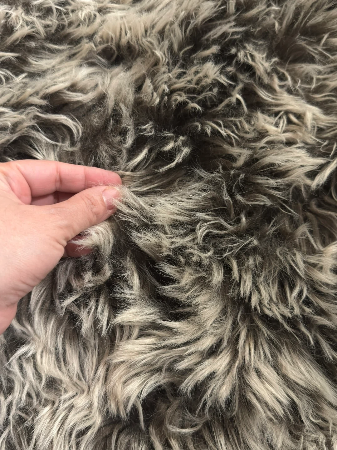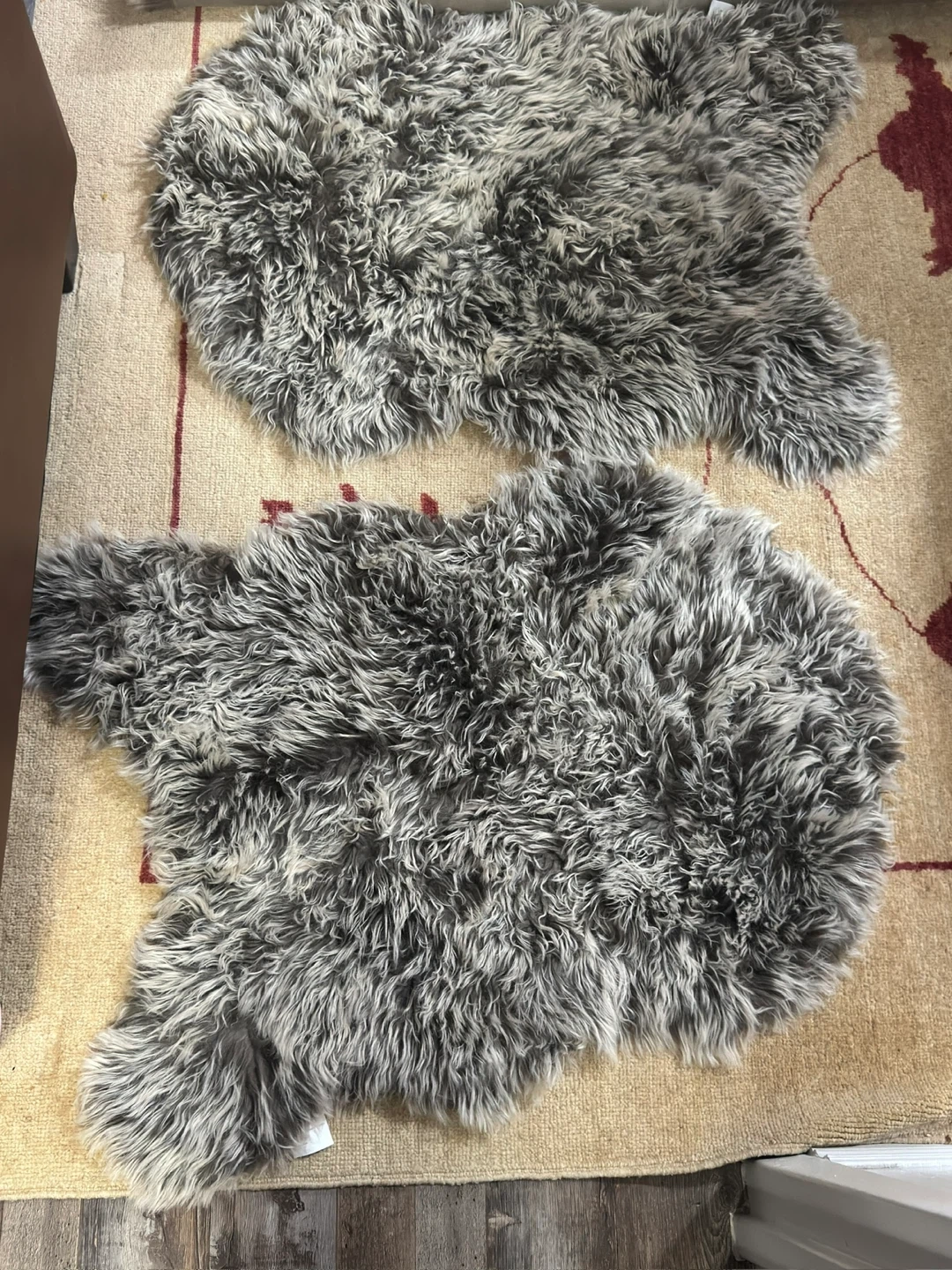 Two fluffy faux fur rugs with a grey and white marbled pattern. They're soft and cozy underfoot. These rugs are approximately 2 feet by 3 feet each. Perfect for adding warmth to any room!