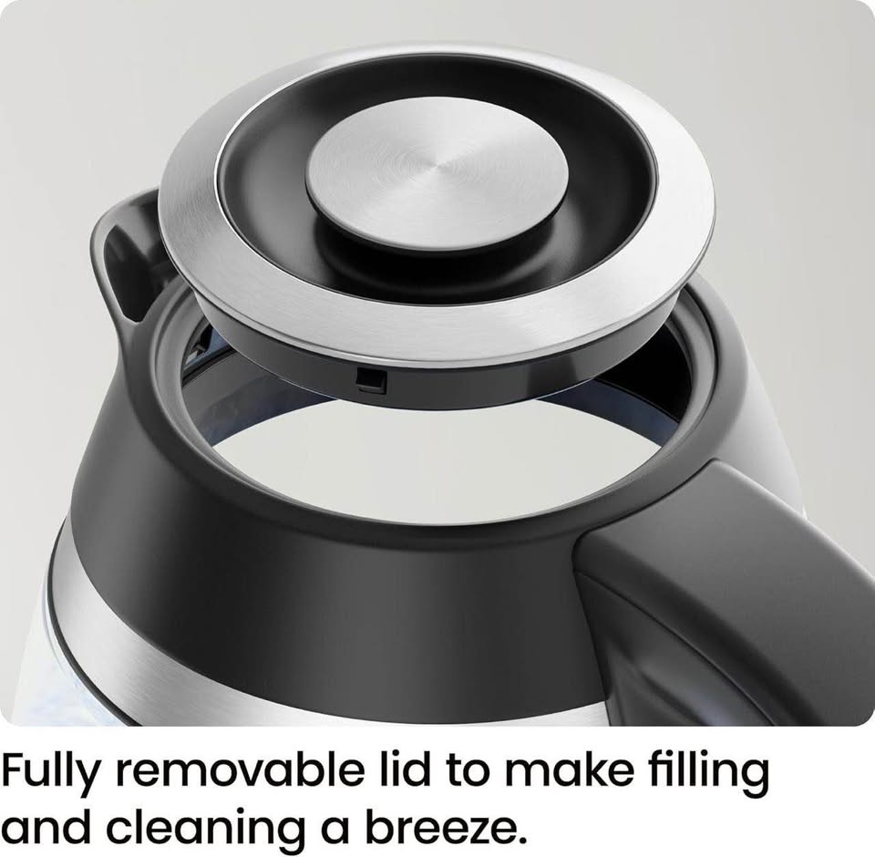 Chefman Electric Kettle, 1.8L, 1500W. Features a removable lid for easy cleaning, auto shut-off, boil-dry protection, stainless steel filter, and is BPA-free. Made with borosilicate glass. Black color.