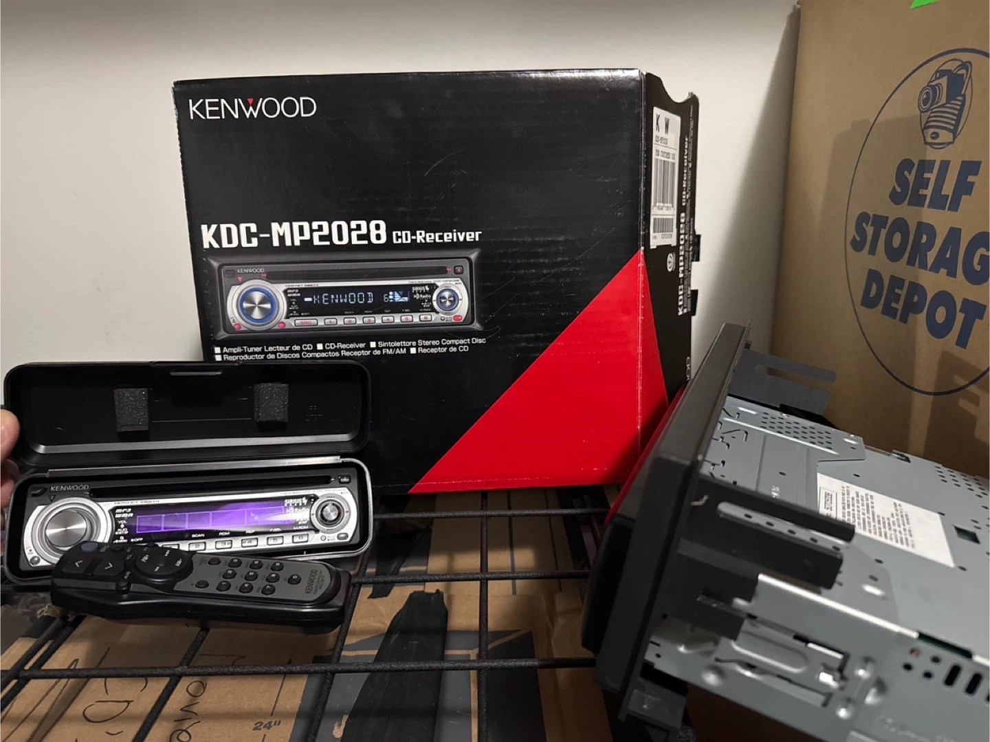 This is a Kenwood KDC-MP2028 CD receiver. It's an in-dash car stereo with a CD player. It includes the receiver, a remote, and its original box.