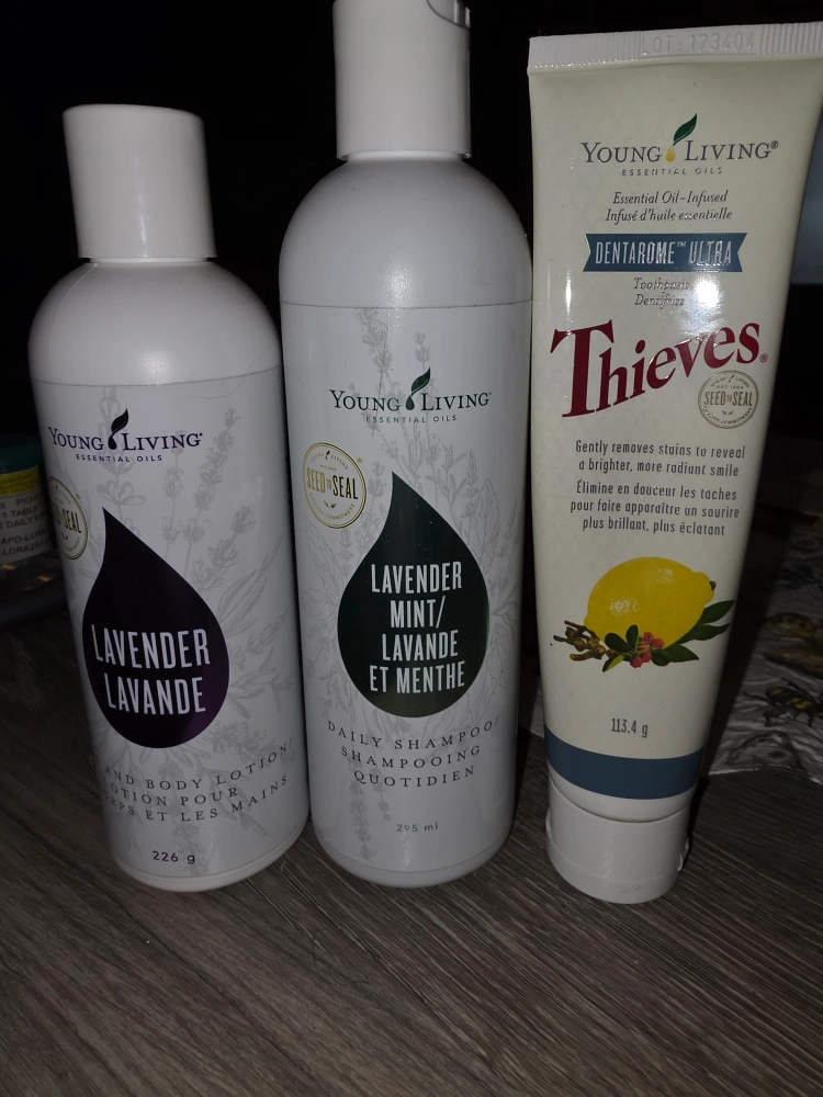 Young Living Lavender & Lavender Mint/Mint Daily Shampoo and Body Lotion set. Thieves Dentarome Ultra toothpaste also included. Body lotion is 226g, shampoo is 295 ml, and toothpaste is 113.4g. Gentle, oil-infused personal care items.