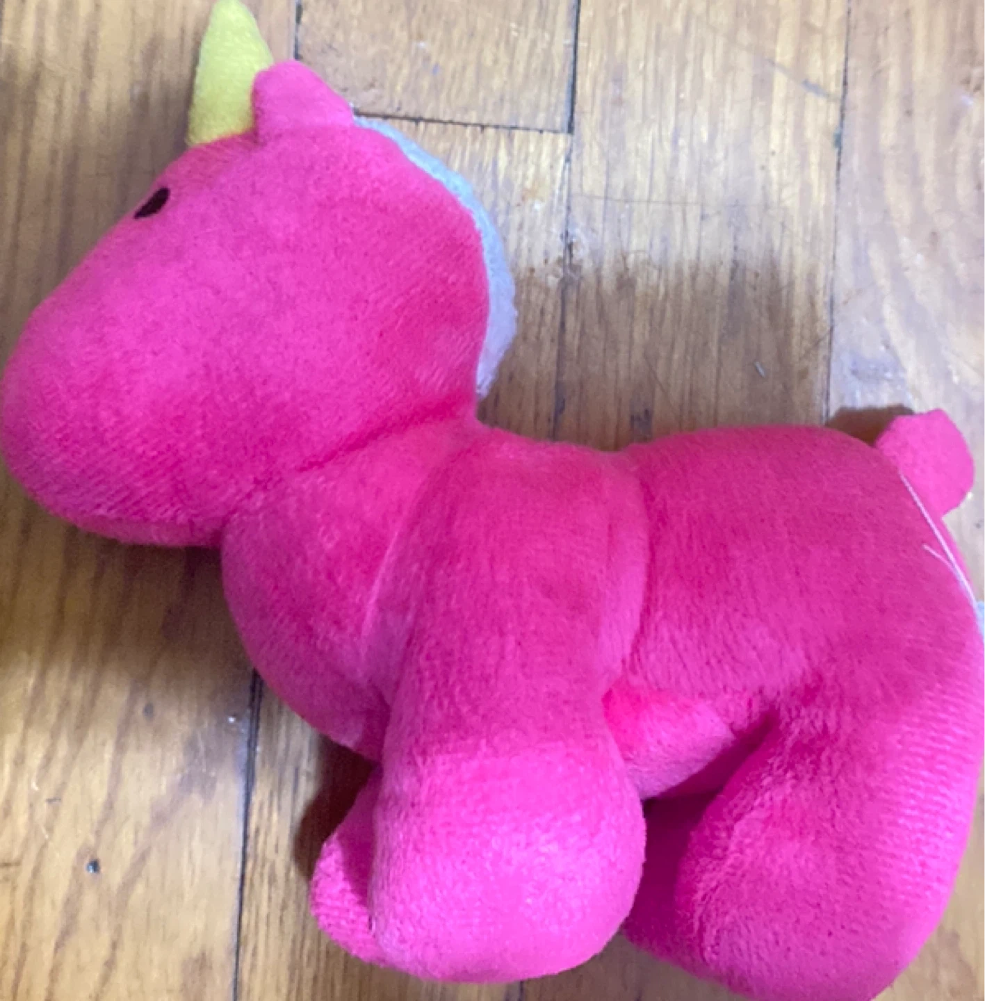 This is a soft, plush unicorn stuffed animal. It's bright pink with a yellow horn and light blue accents on its mane. The material is fuzzy and huggable.