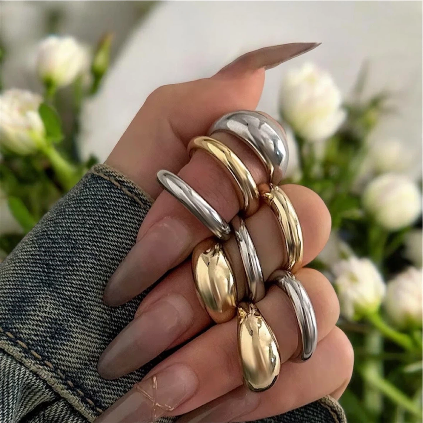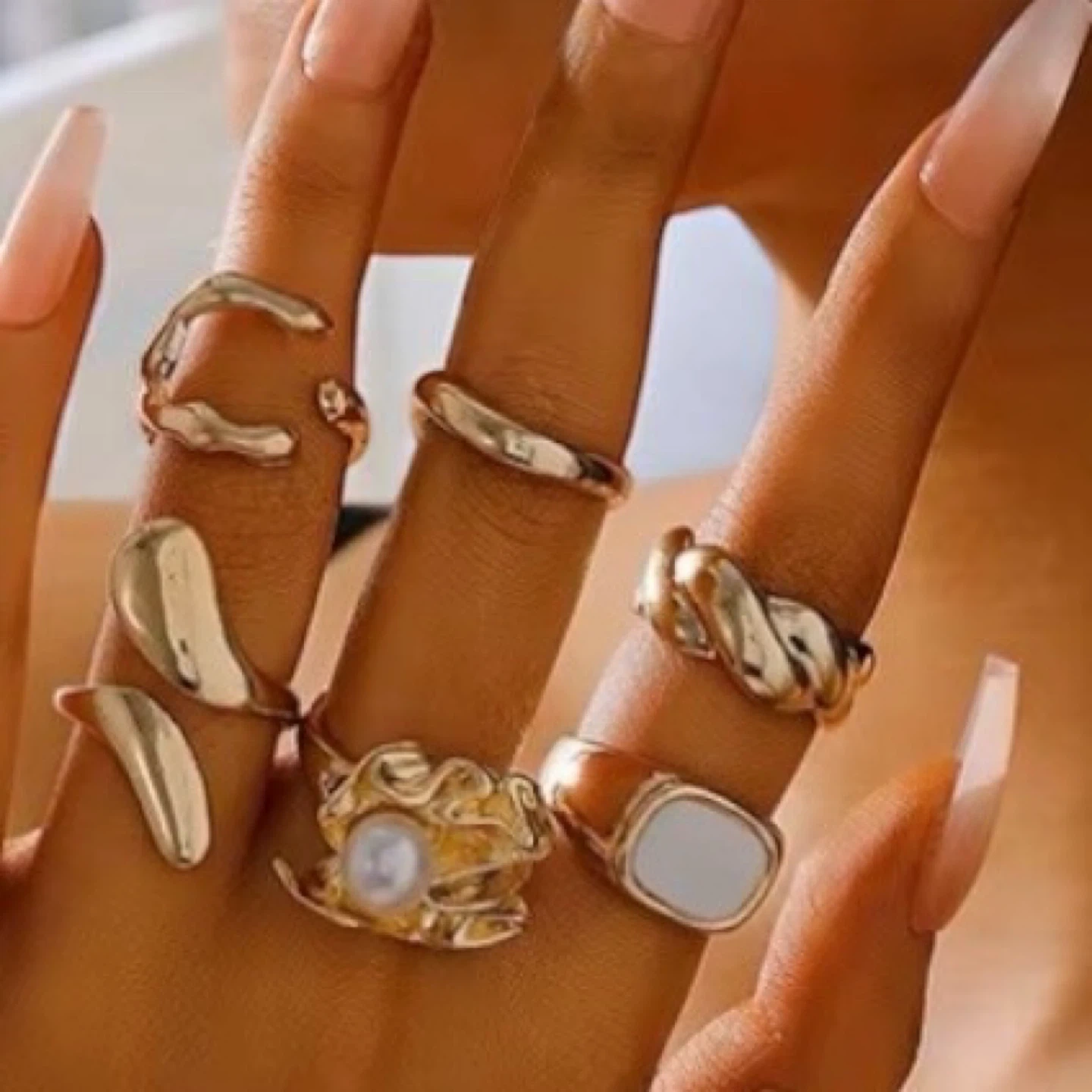This set includes eight unique rings with mixed metal finishes. Designs vary from chunky bands to intricate patterns. They're perfect for adding a stylish accent to any outfit. A great way to mix and match your look!