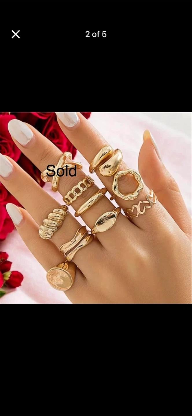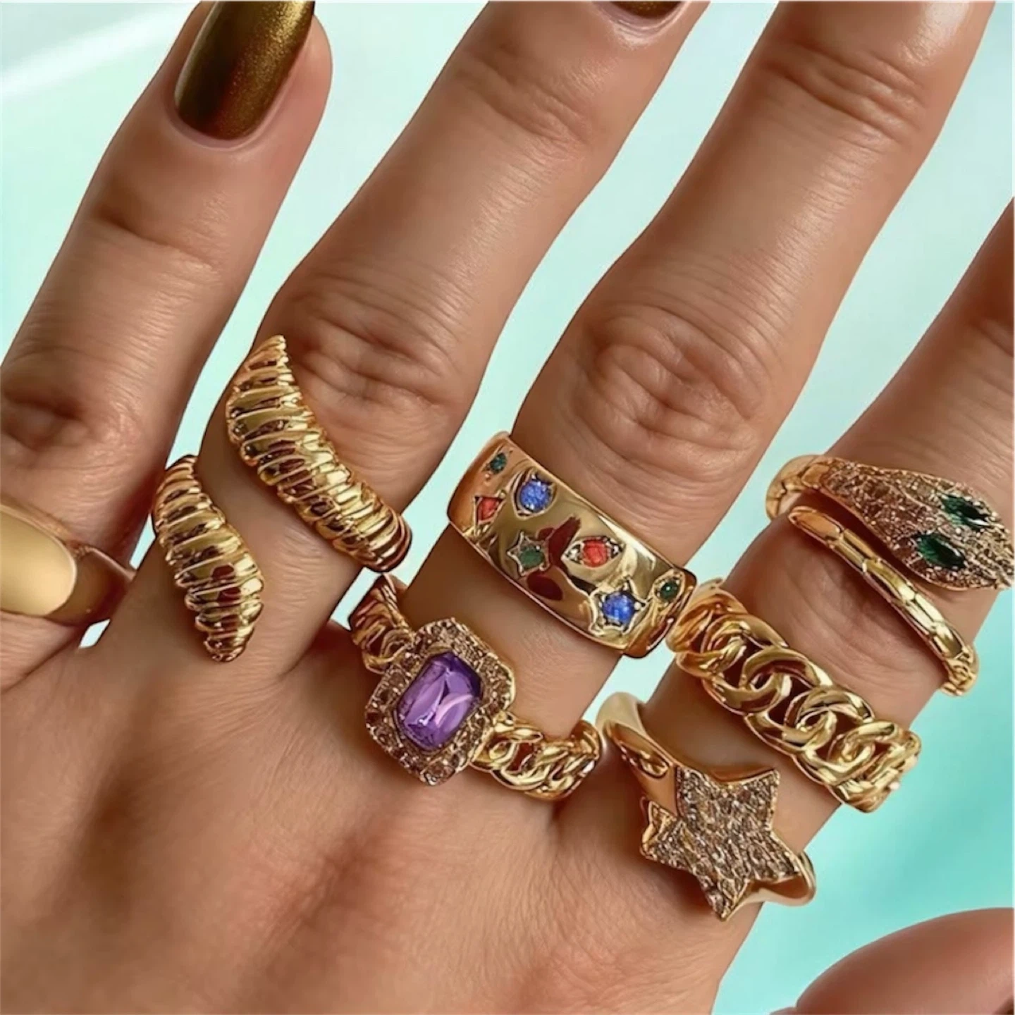 This set includes eight unique rings with mixed metal finishes. Designs vary from chunky bands to intricate patterns. They're perfect for adding a stylish accent to any outfit. A great way to mix and match your look!