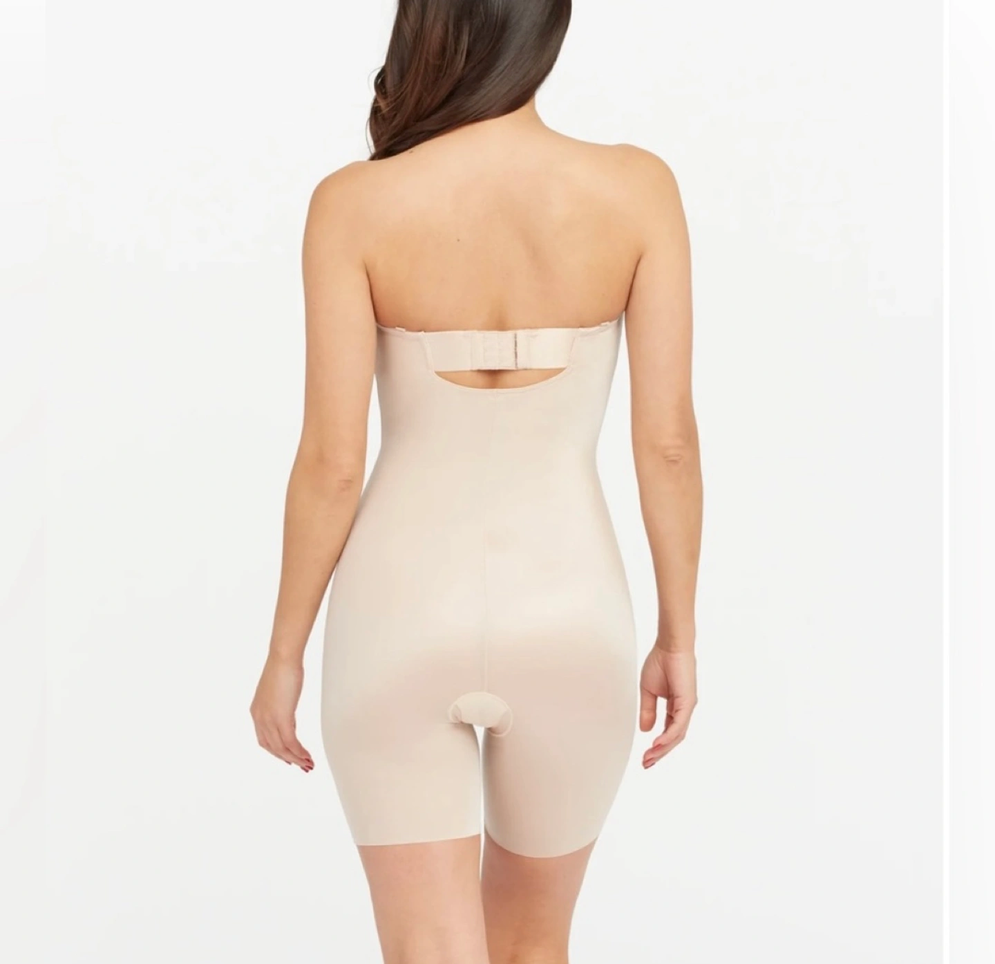 Brand new with tags tried on once. This body suit is named the âSuit Your Fancy Strapless Cupped Mid-Thigh Bodysuitâ from Spanx