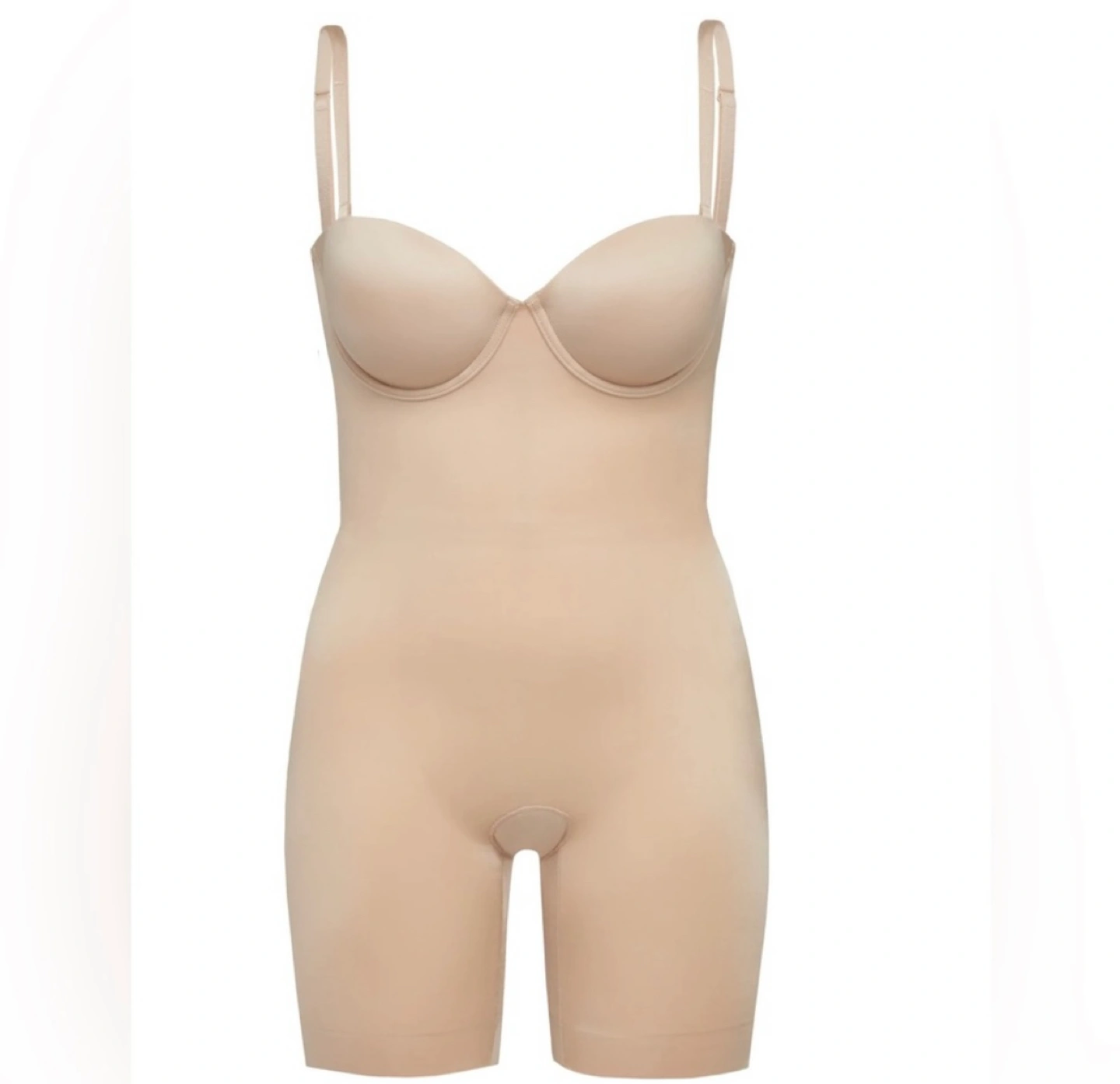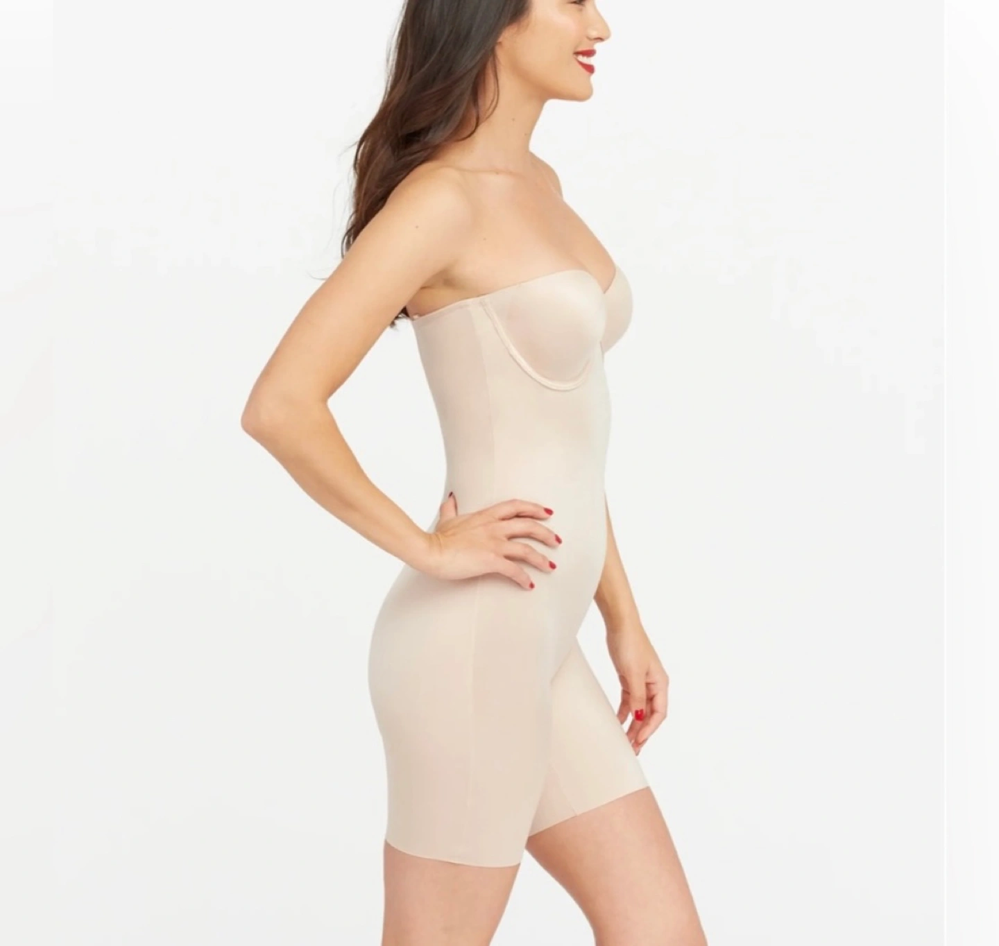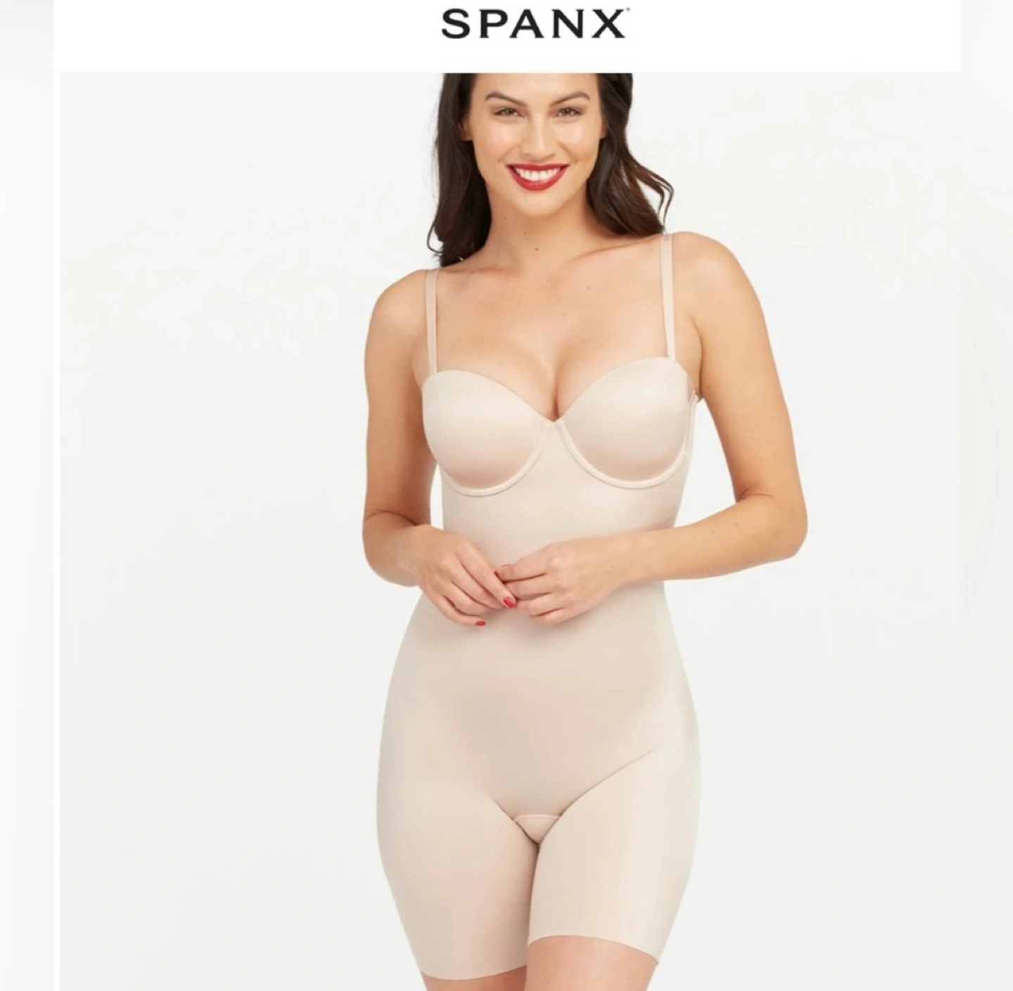 Brand new with tags tried on once. This body suit is named the âSuit Your Fancy Strapless Cupped Mid-Thigh Bodysuitâ from Spanx