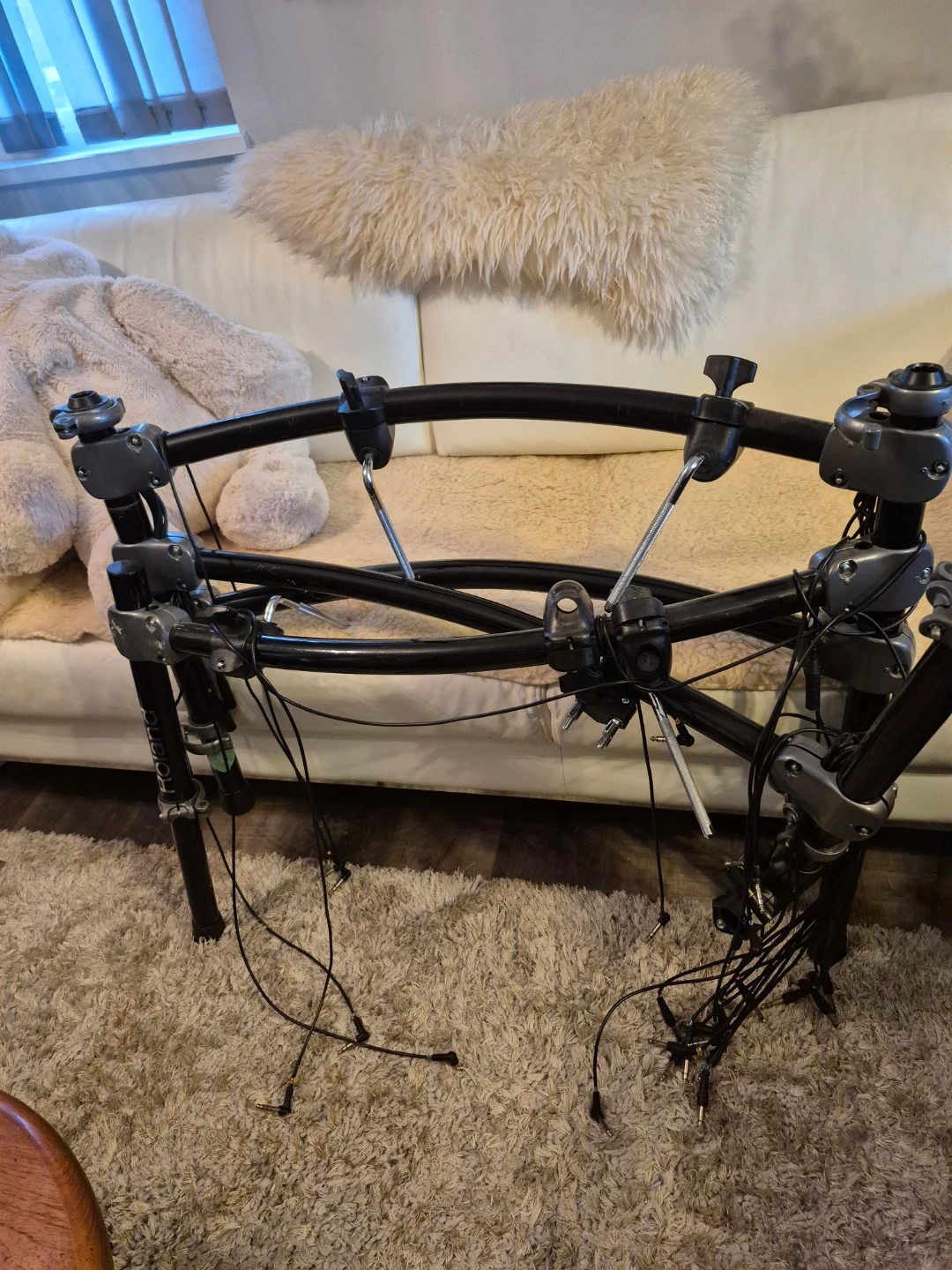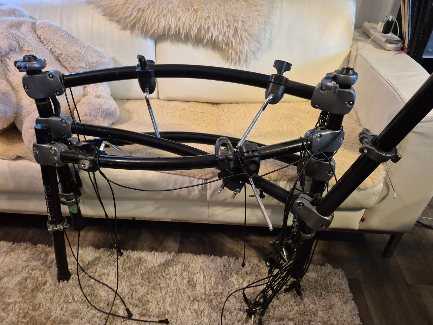 This is a Roland drum rack frame. It's made of durable metal and plastic components. The rack has multiple clamps and arms for mounting drum pads and cymbals.
