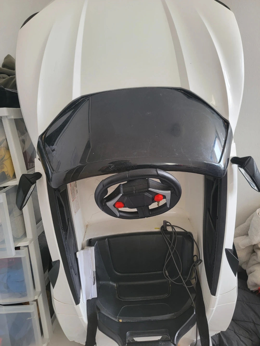 This is a white ride-on toy car with a black steering wheel and seat. It has a seatbelt for safety. Suitable for young children to enjoy driving indoors or outdoors.
