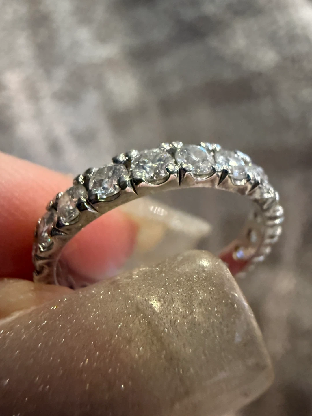 A beautiful Moissanite eternity band ring size 5.5 featuring a full circle of sparkly stones. This ring is made from sterling silver. Never used. Comes with pouch. Velvet box is $5 extra.