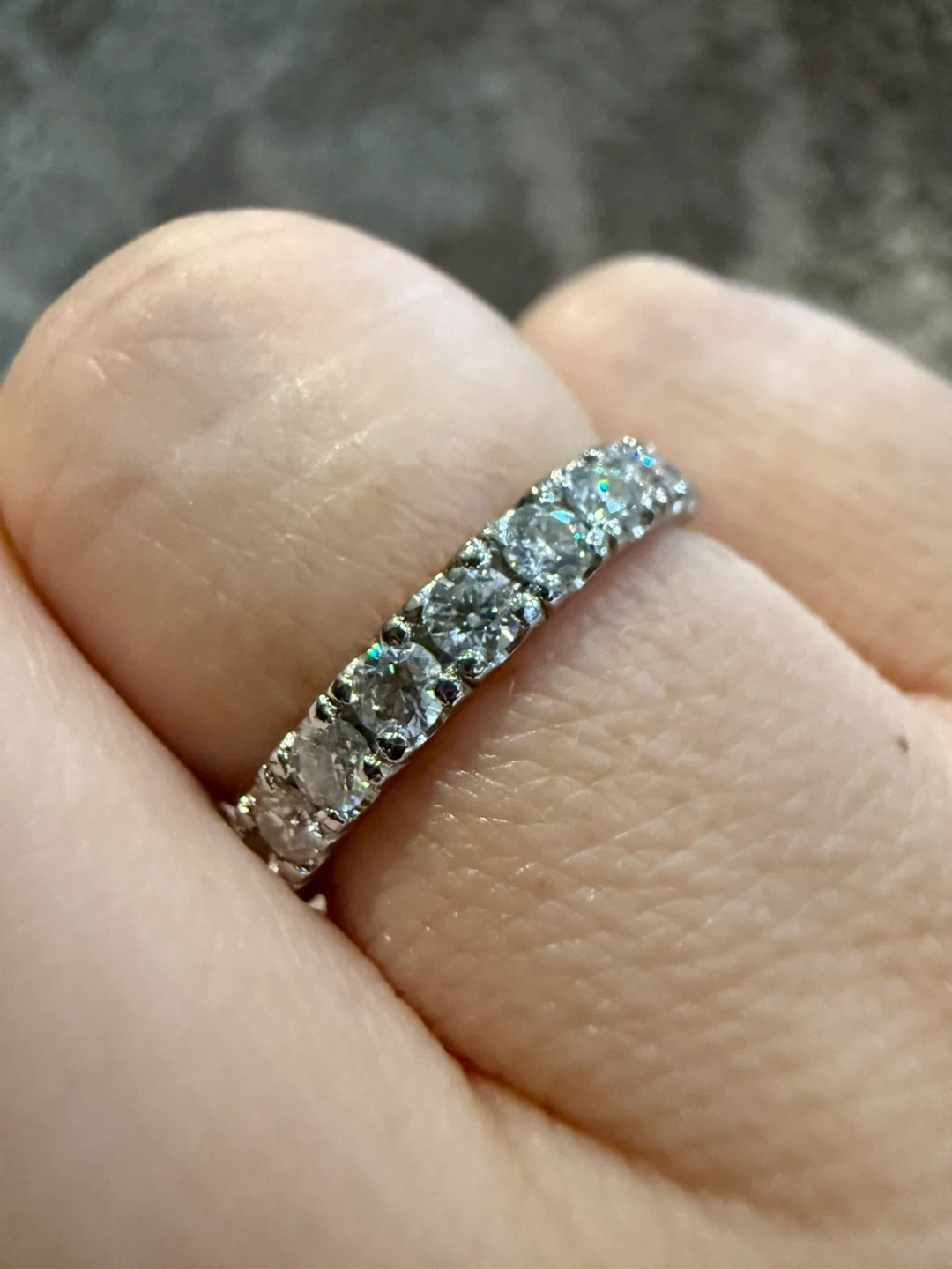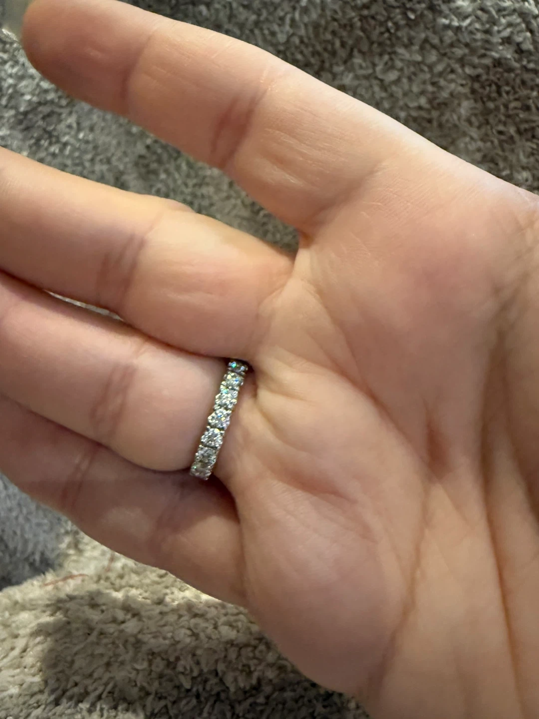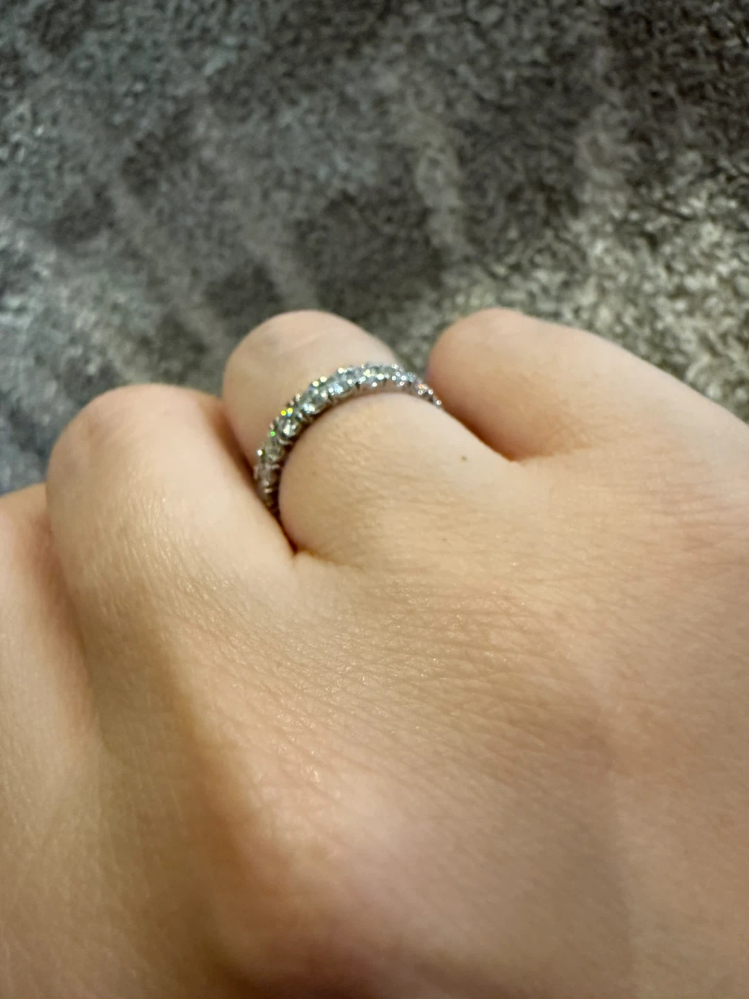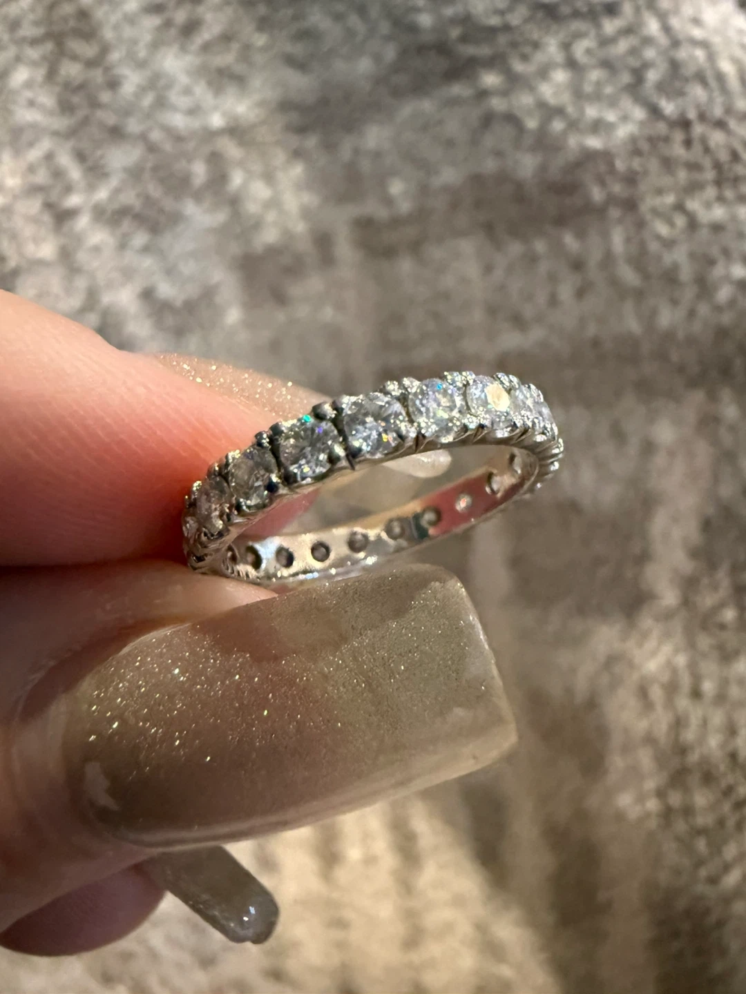 A beautiful Moissanite eternity band ring size 5.5 featuring a full circle of sparkly stones. This ring is made from sterling silver. Never used. Comes with pouch. Velvet box is $5 extra.