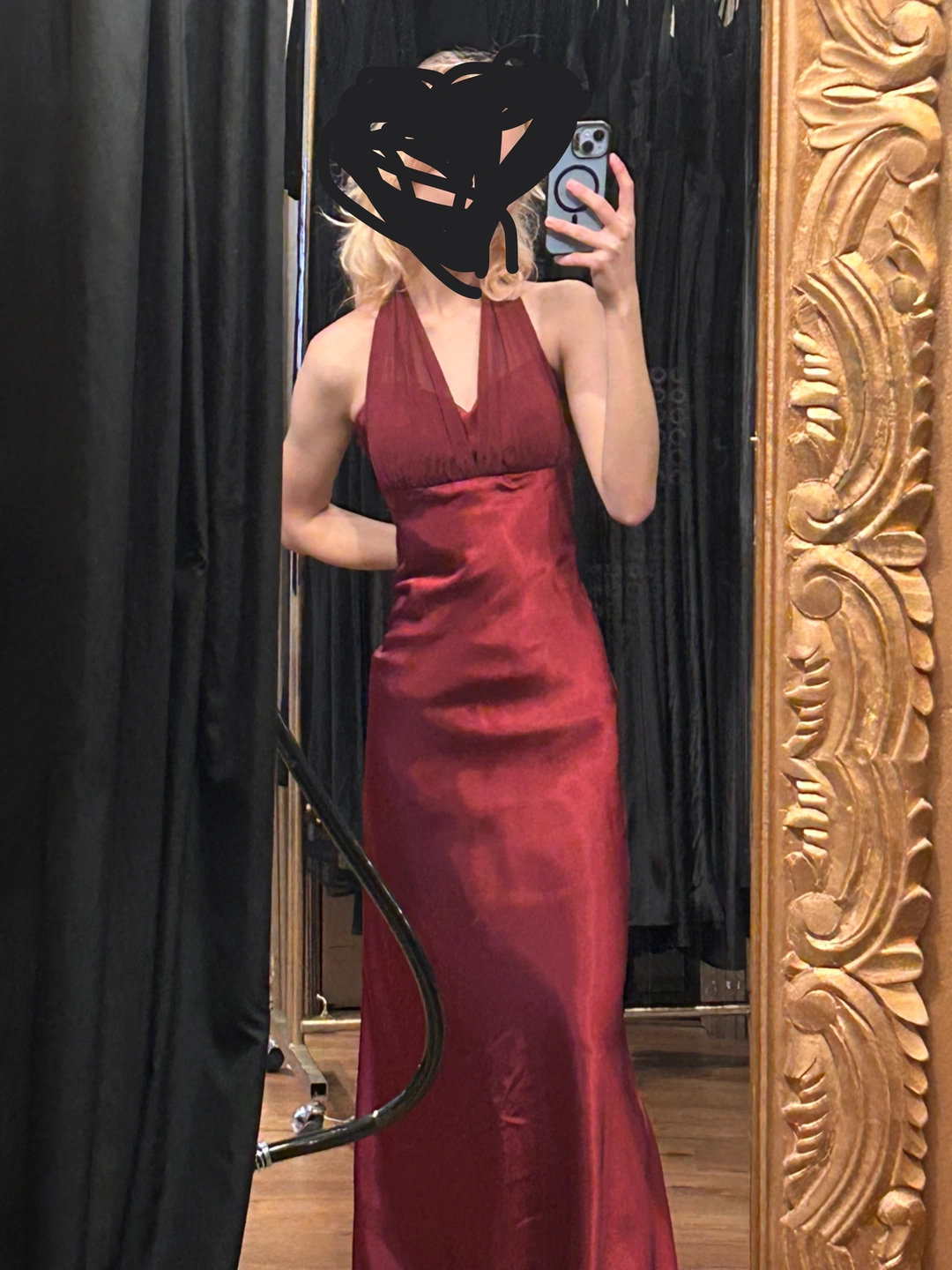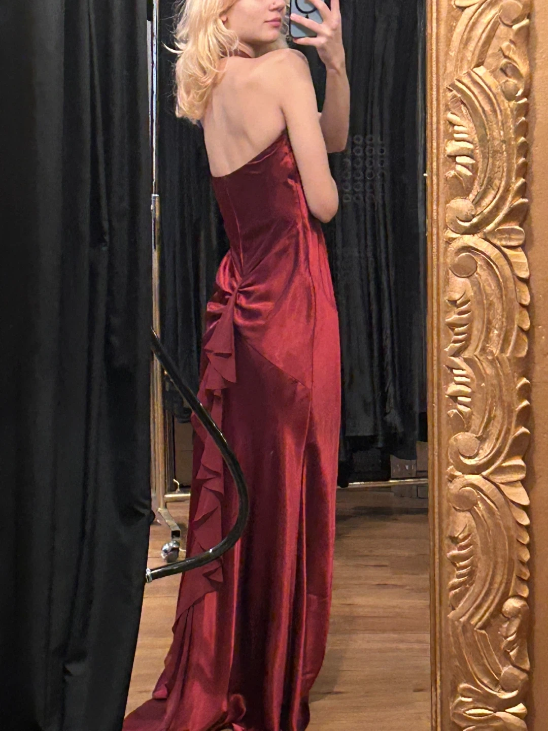 Elegant burgundy satin evening gown with a halter neckline and a ruffled back detail. It's a floor-length dress perfect for formal events or galas. Features a flattering silhouette.