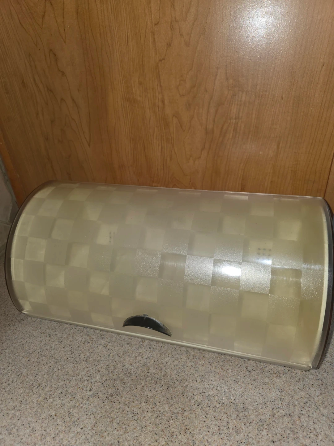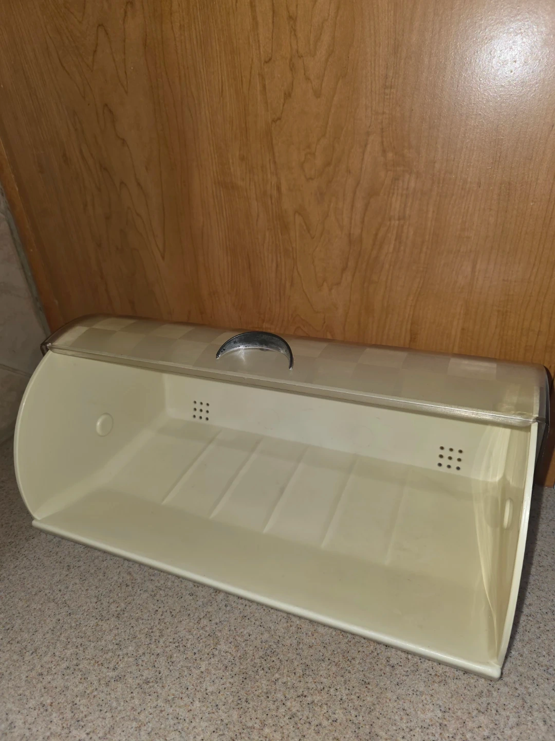 The design features a distinctive cream-colored, checkered, translucent plastic roll-top door. It has chrome accents along the edges and a dark, possibly black, handle. This style of bread box was popular in the 1950s and 1960s. Similar items are often sold as rare, retro kitchen finds.
