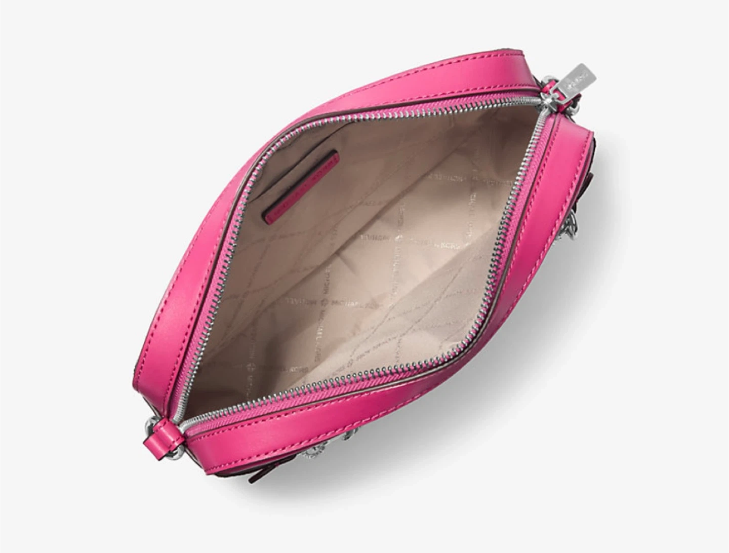 This Michael Kors camera bag features a pink ombre logo print. It has a zip-around closure and an adjustable crossbody strap. The interior is lined with the Michael Kors logo pattern.
