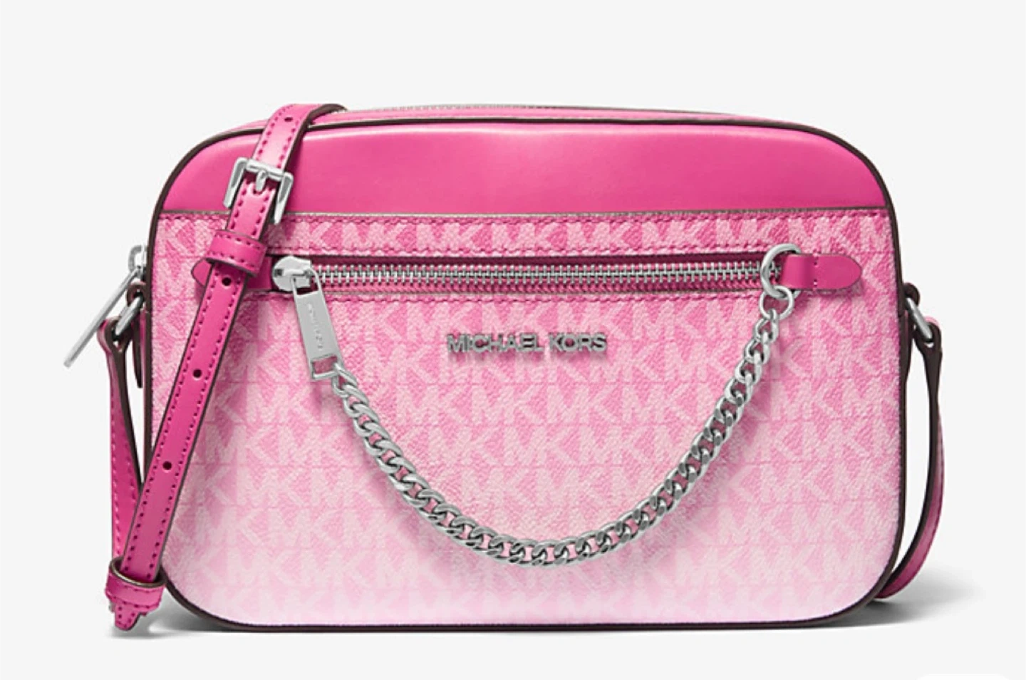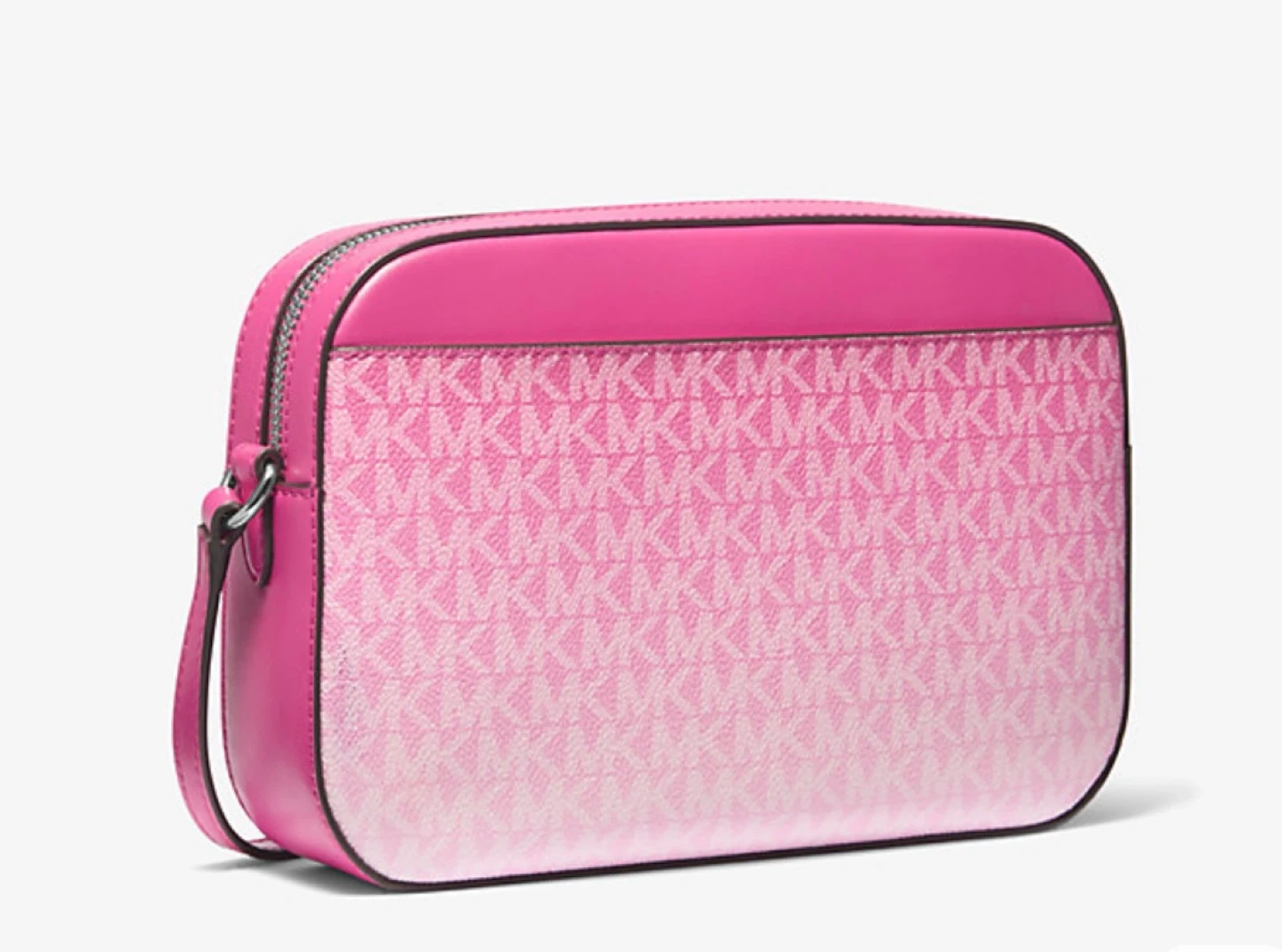 This Michael Kors camera bag features a pink ombre logo print. It has a zip-around closure and an adjustable crossbody strap. The interior is lined with the Michael Kors logo pattern.