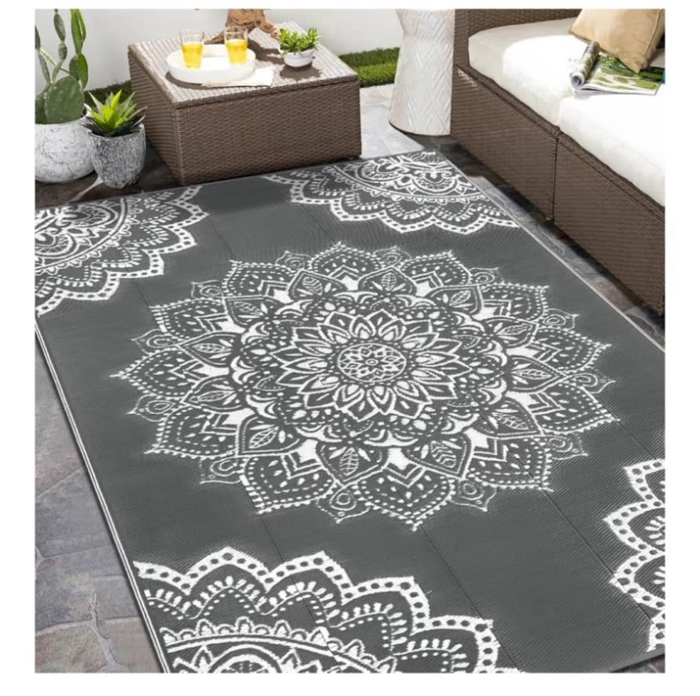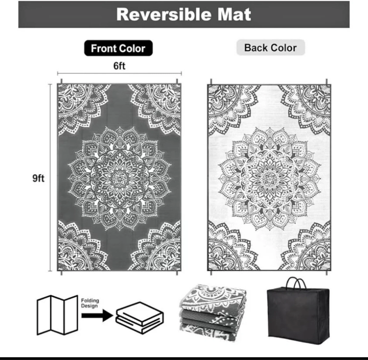 This is a reversible outdoor mat, measuring 6ft by 9ft. It's designed with a folding structure for easy storage and includes a carrying bag. Great for patios or camping!