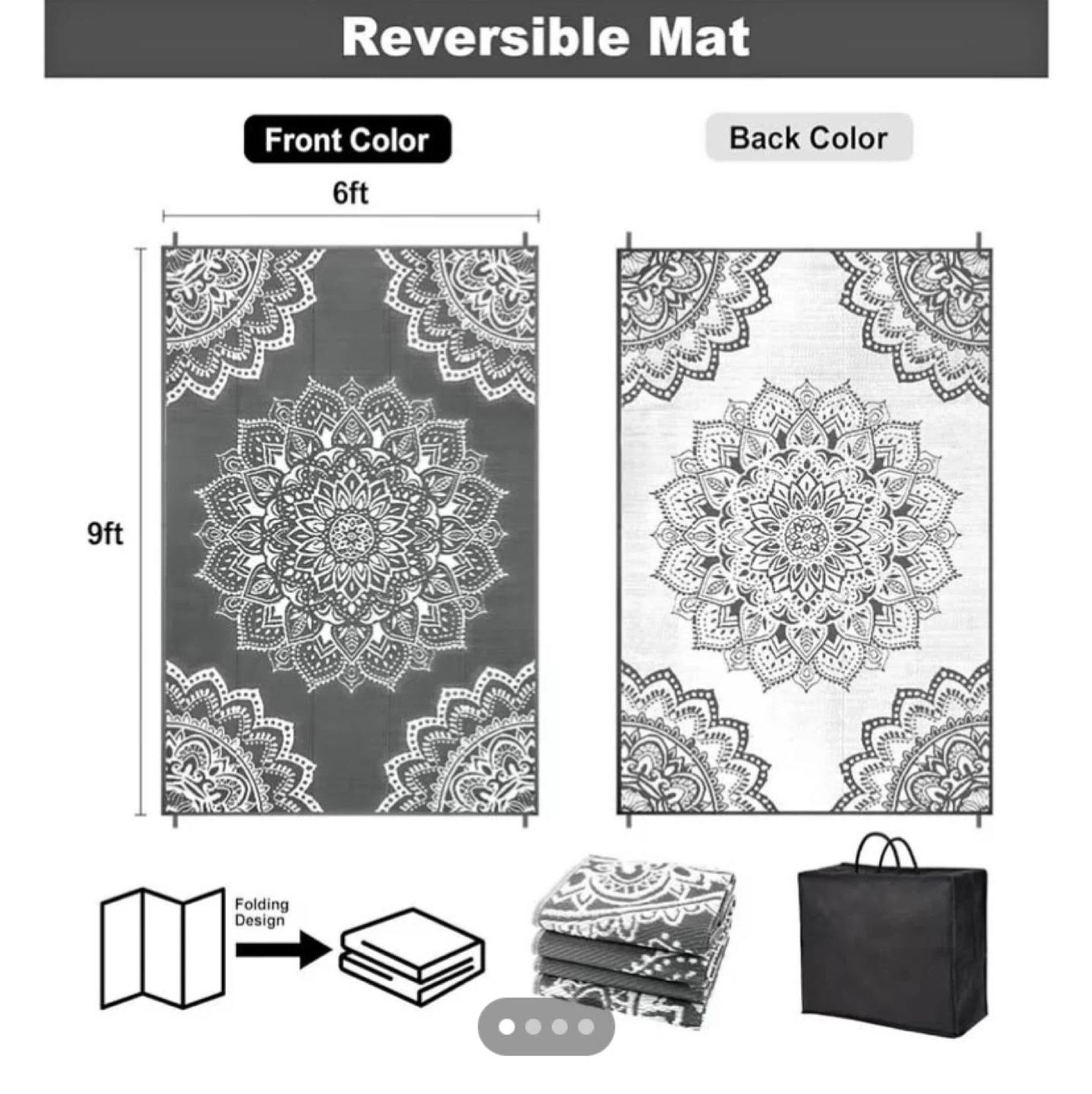 This is a reversible outdoor mat, measuring 6ft by 9ft. It's designed with a folding structure for easy storage and includes a carrying bag. Great for patios or camping!