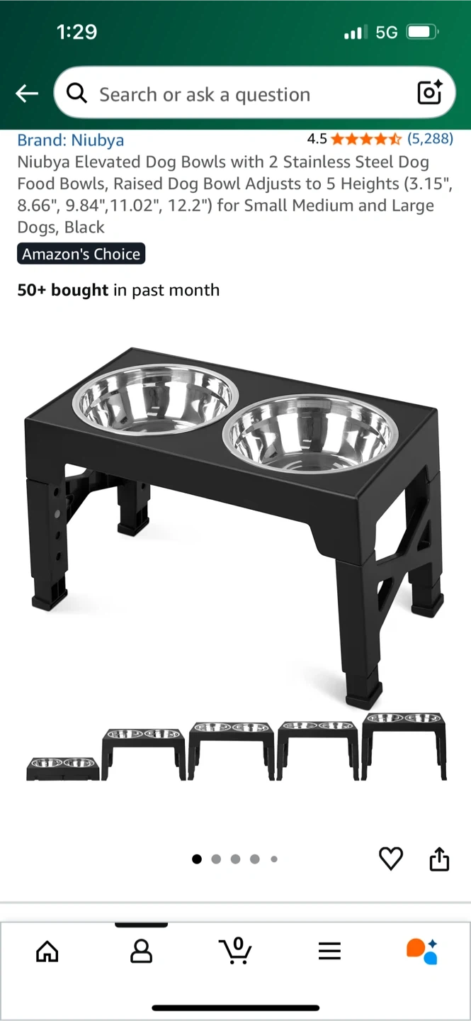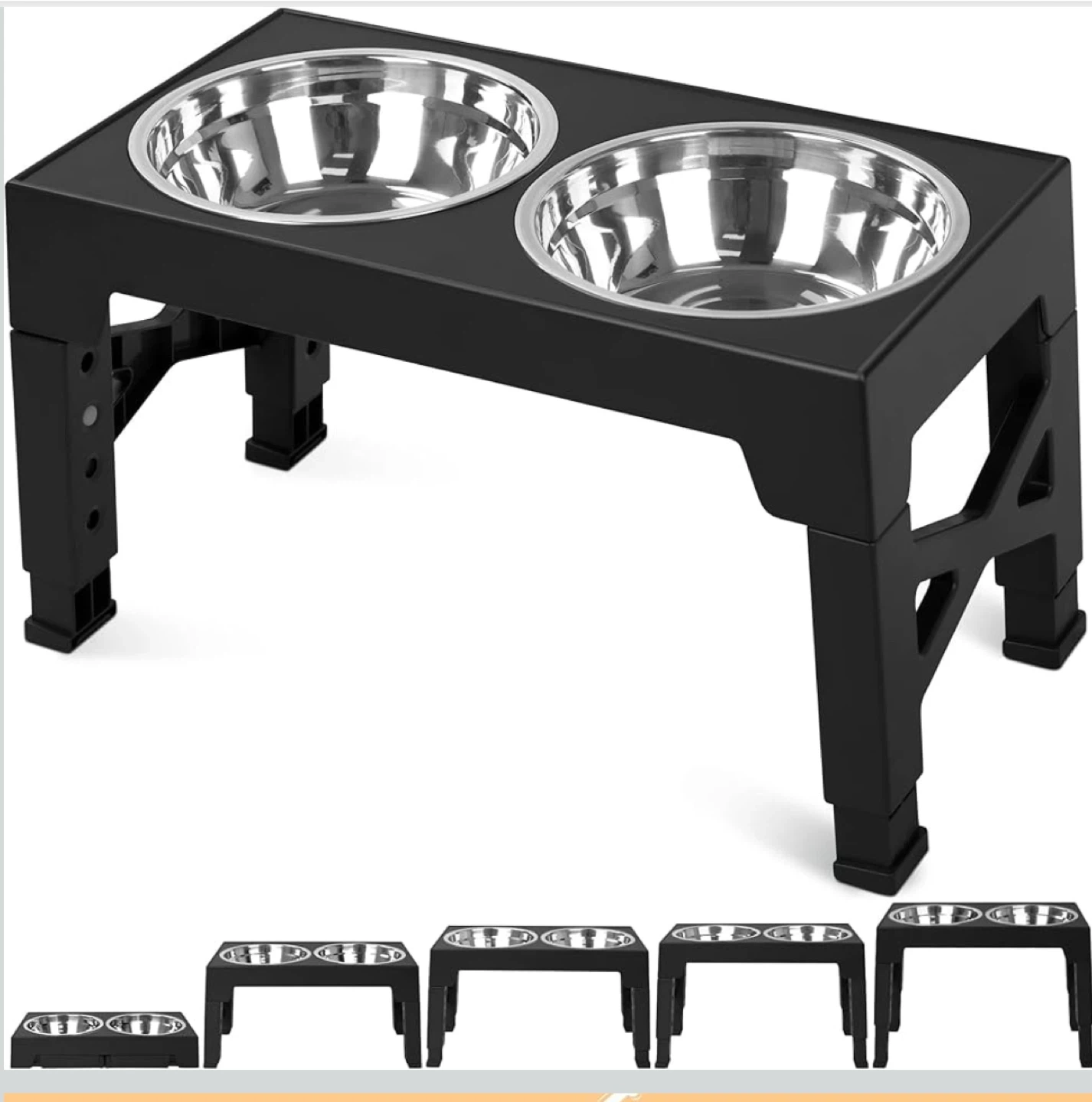Selling Unused a set of Niubya elevated dog bowls, complete with two food-safe stainless steel bowls. The stand is black and designed to adjust to different heights, making it suitable for small, medium, and large dogs. The bowls are dishwasher safe and the stand features a noise-free rubber rim and a no-slip base for quiet dining