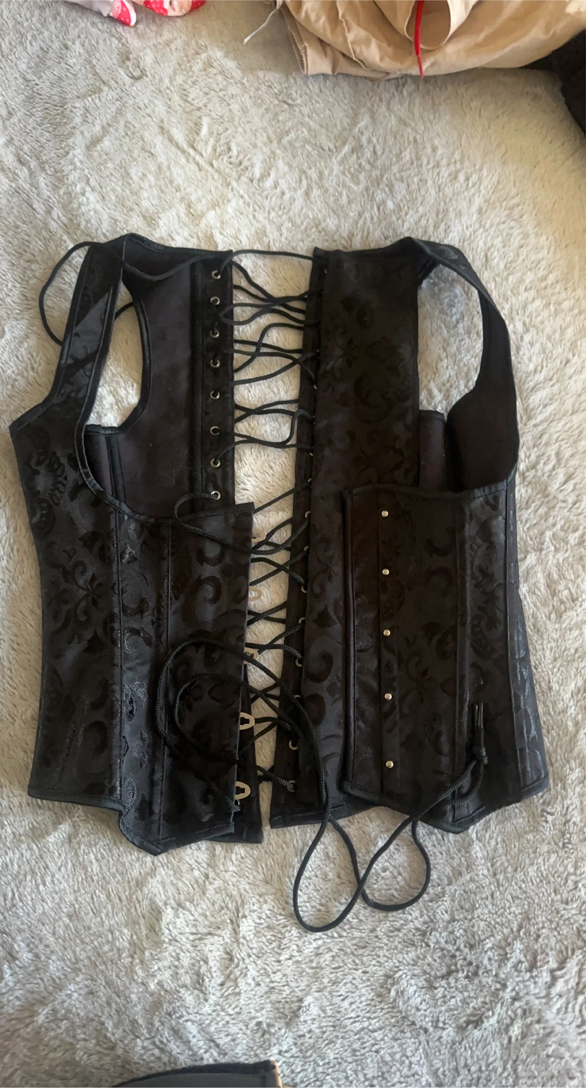 This black corset vest features a brocade pattern. It has adjustable lacing in the back and a hook-and-eye closure in the front. Made of polyester and spandex.