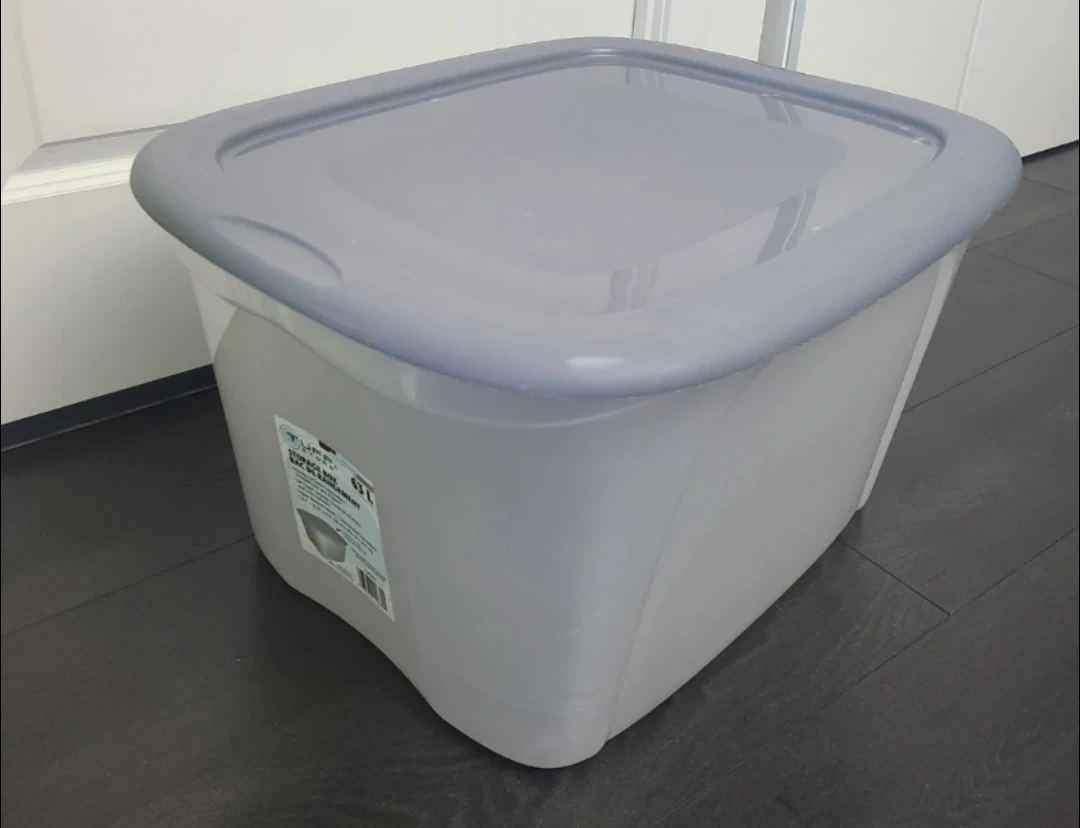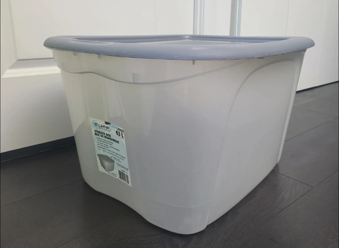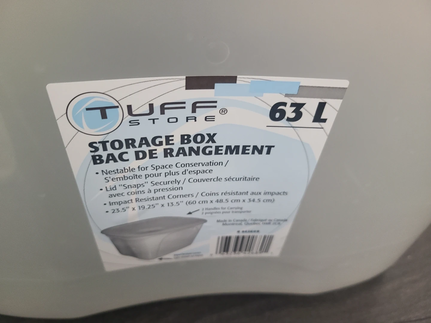 Tuff Store storage box with a 63L capacity. Features a lid that snaps securely and impact-resistant corners. Dimensions are 23.5" x 19.25" x 13.5".