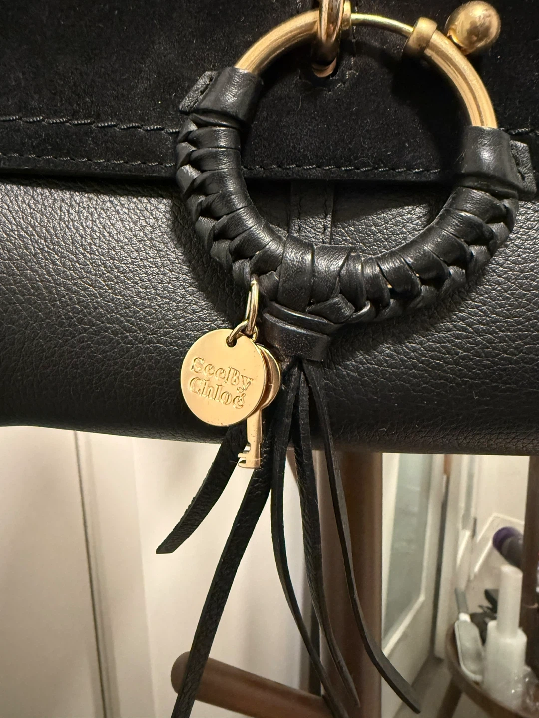 This See by Chloé Joan bag is crafted from black grained leather with suede detailing. It features a signature ring closure and includes a small key charm. A stylish accessory for everyday use.