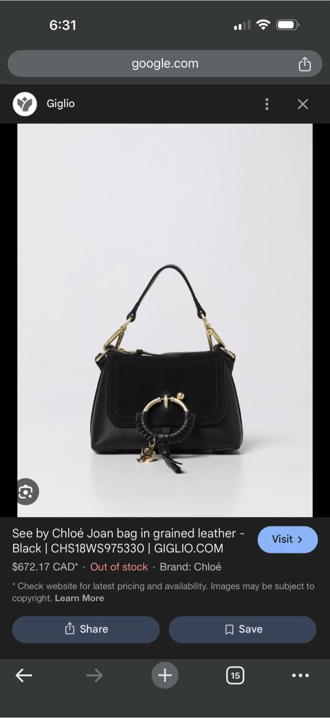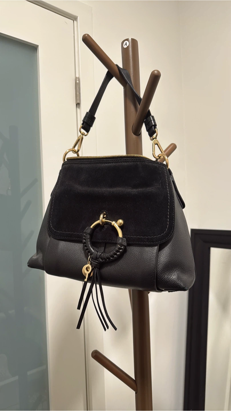 This See by Chloé Joan bag is crafted from black grained leather with suede detailing. It features a signature ring closure and includes a small key charm. A stylish accessory for everyday use.