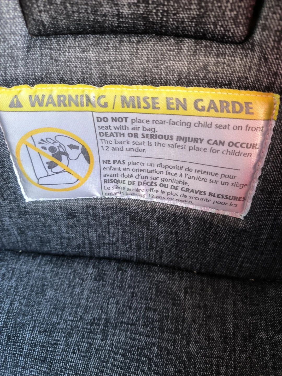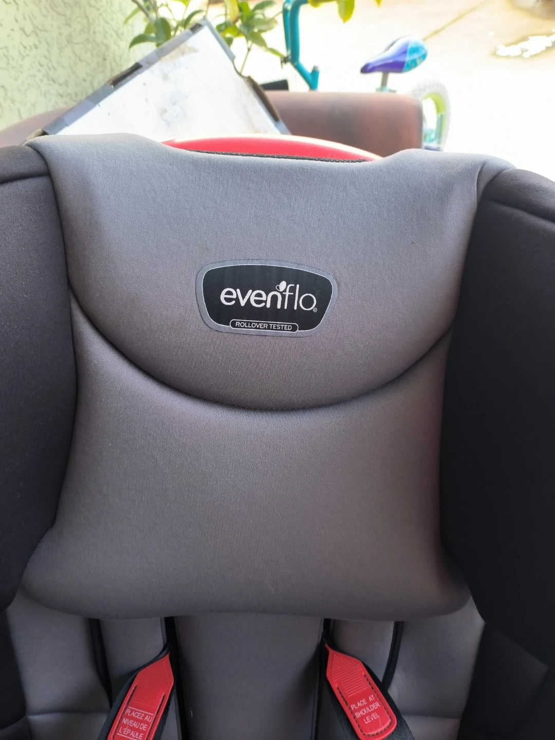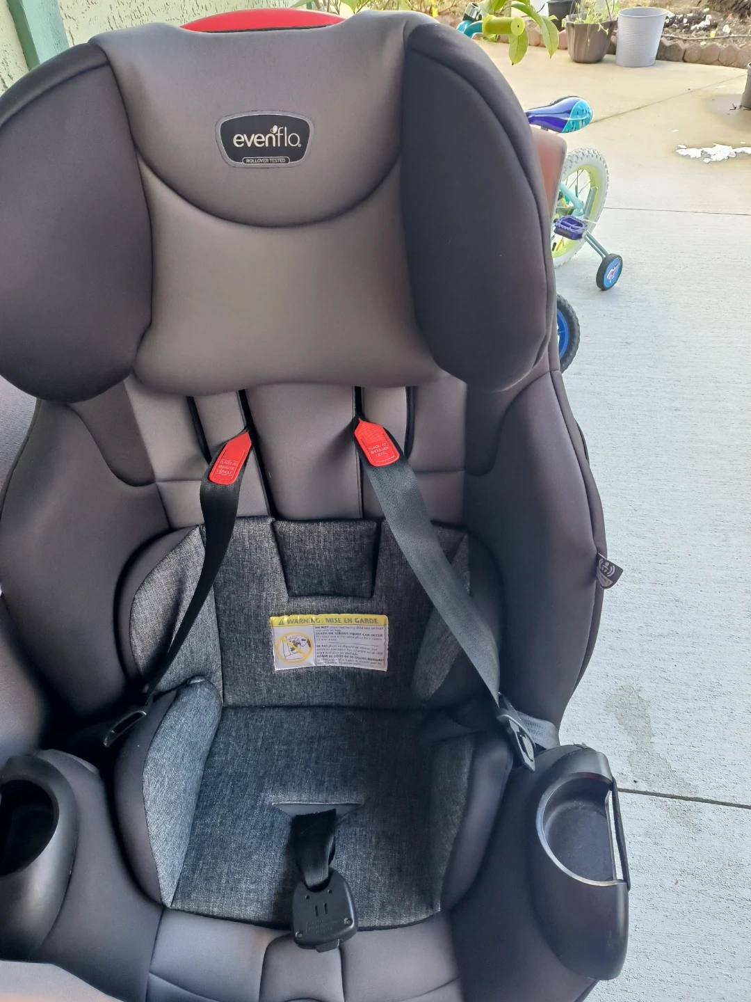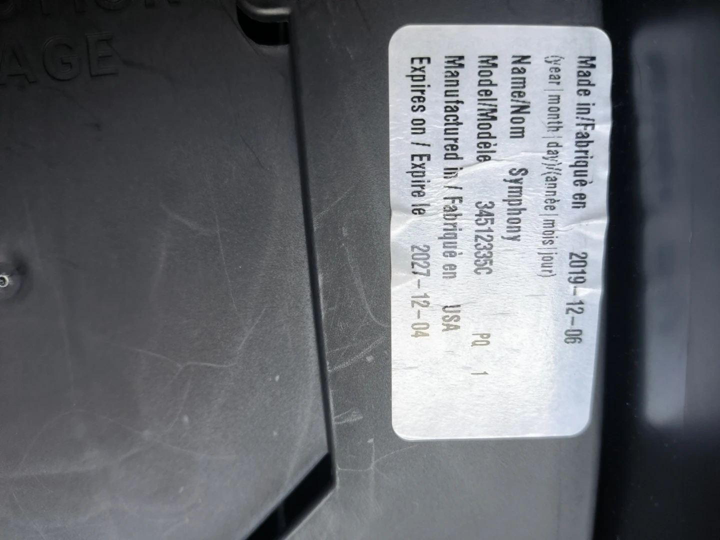 Evenflo Symphony car seat in grey and black. Manufactured on 2019-12-06, expires on 2027-12-04. Rollover tested. It's designed for children 12 and under.