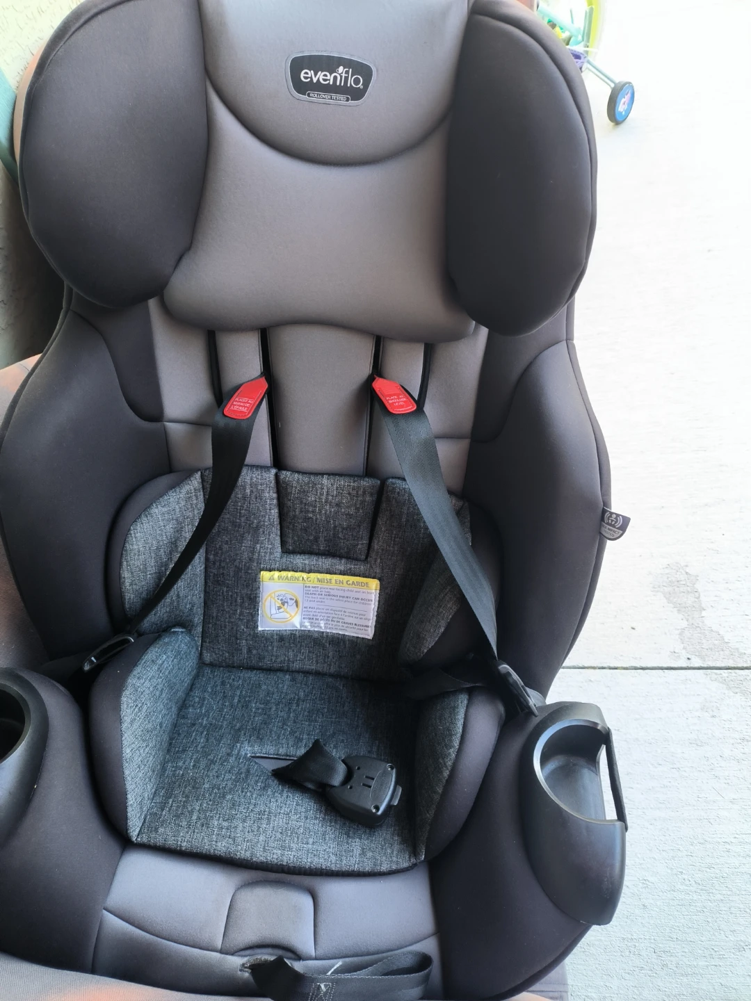 Evenflo Symphony car seat in grey and black. Manufactured on 2019-12-06, expires on 2027-12-04. Rollover tested. It's designed for children 12 and under.