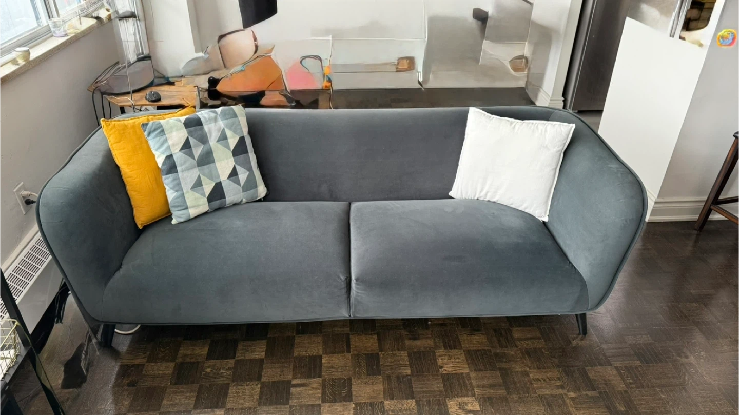 Grey Velvet Sofa with 5 Throw Pillows
