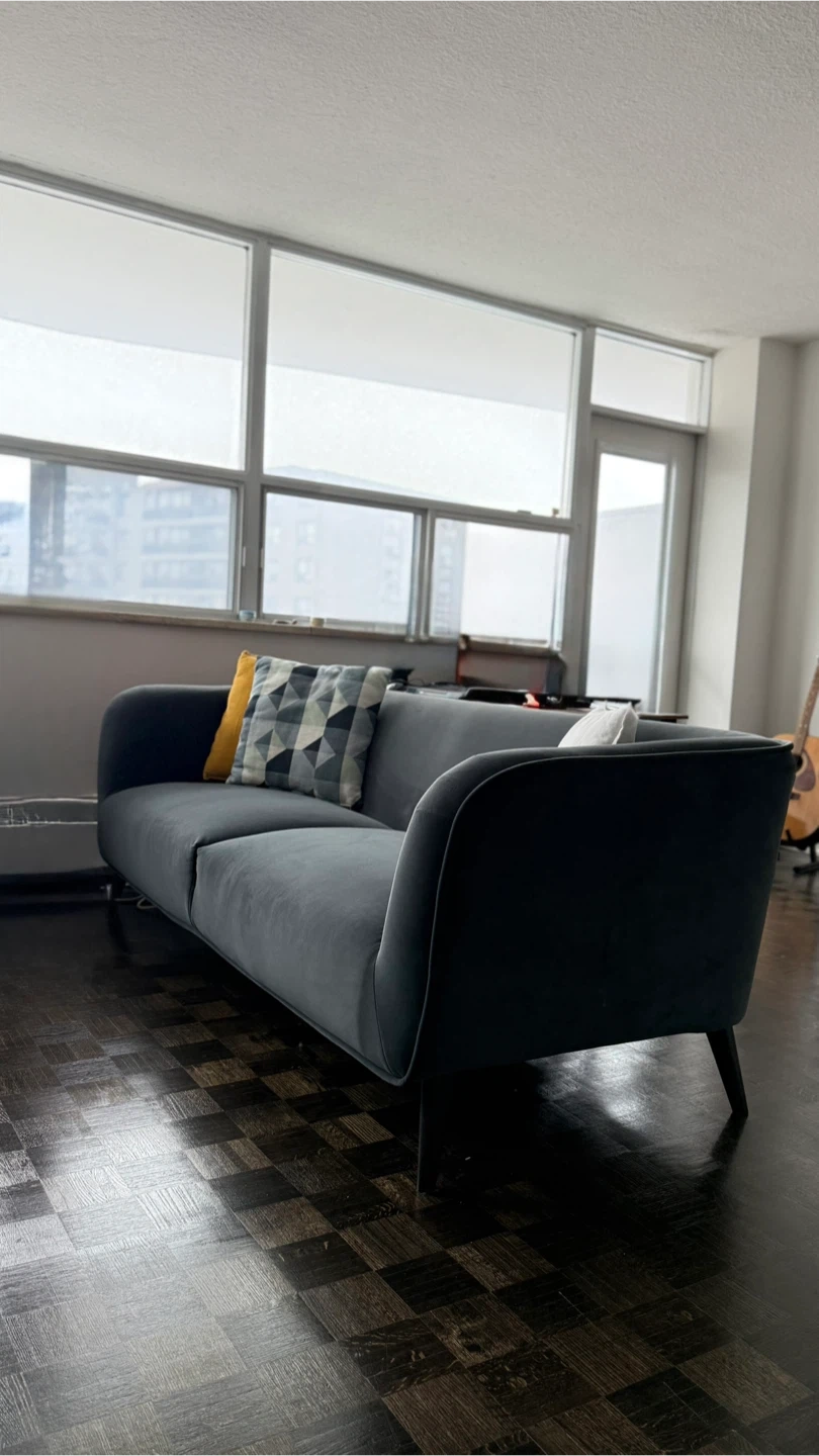Comfortable grey velvet sofa. Includes two accent pillows and three matching throw pillows. Upholstered in soft velvet fabric.