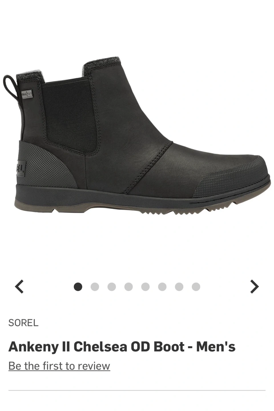 Waterproof Sorel Ankeny II Chelsea OD boots for men. Features a waterproof construction and comfortable fleece lining. They're great for wet weather and casual wear. Rubber sole provides good traction.
