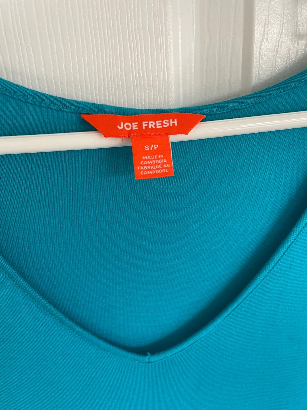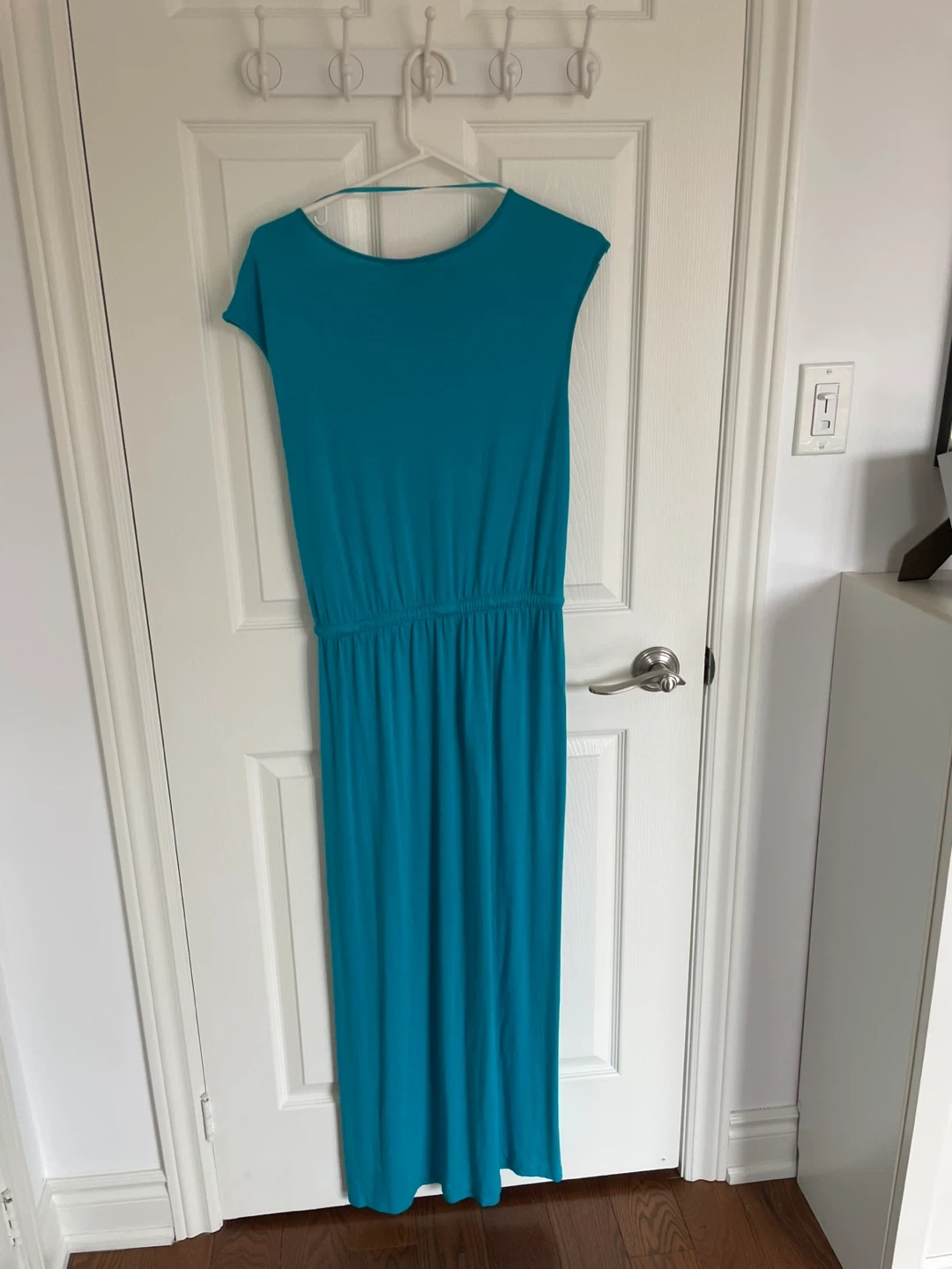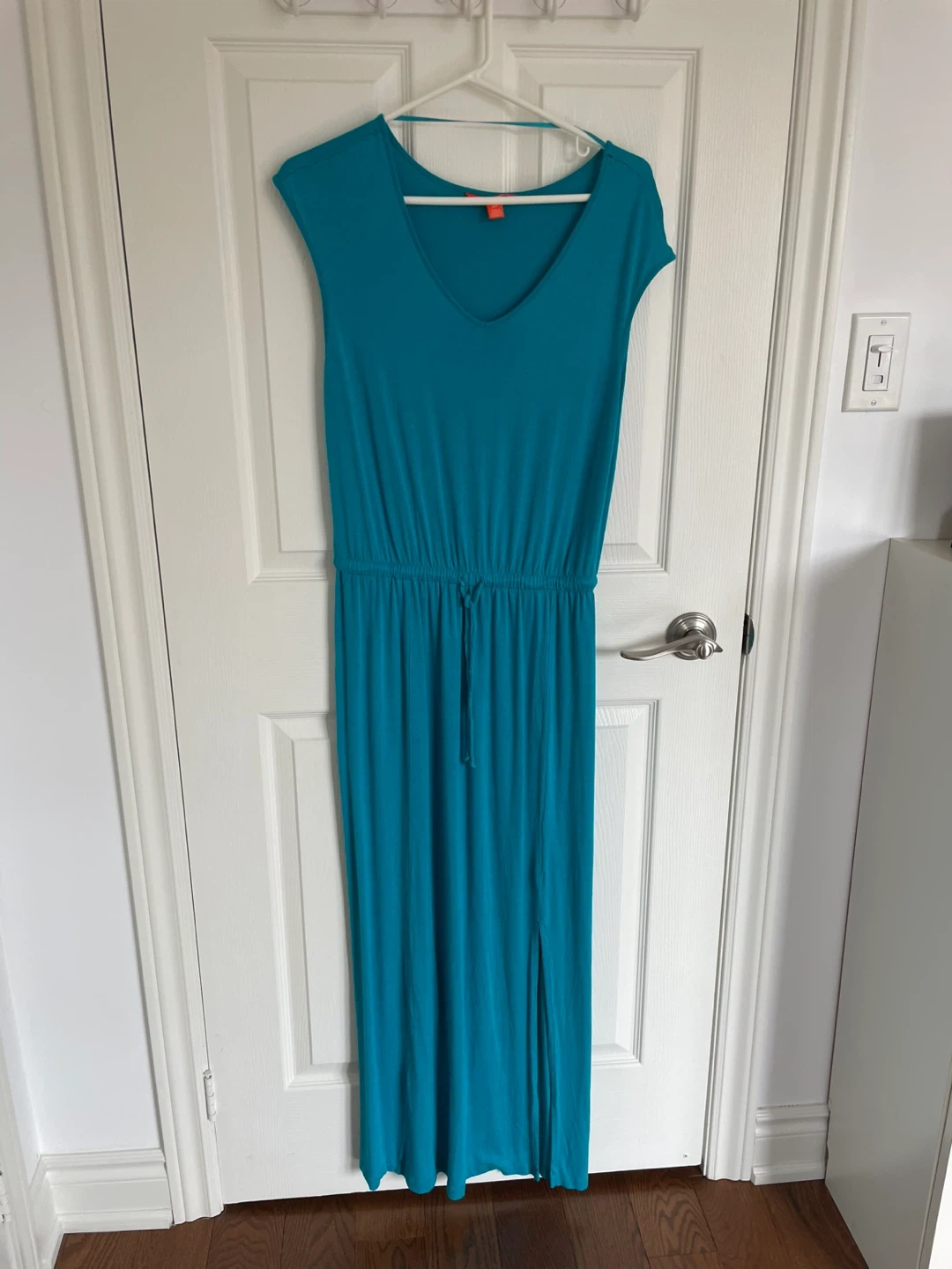 This is a teal maxi dress from Joe Fresh. It features a drawstring waist and a V-neck.