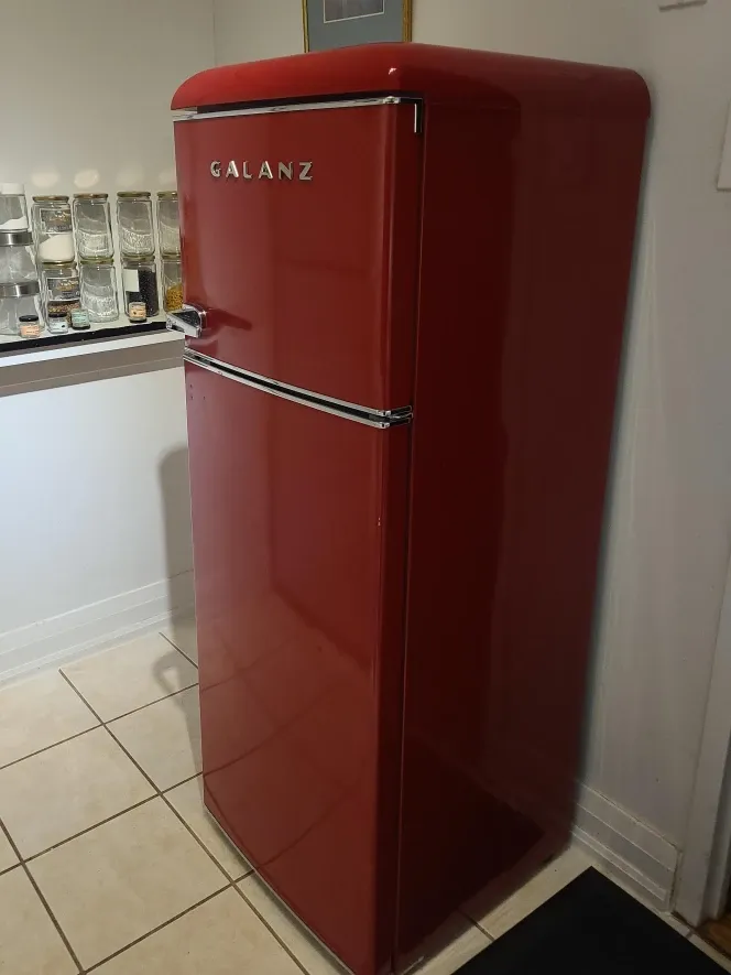 Selling a Galanz retro-style refrigerator in a vibrant red colour. This fridge adds a unique touch to any kitchen with its vintage design. It’s in great condition and ready to keep your food fresh and cool!