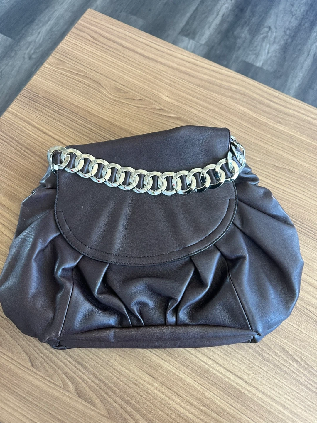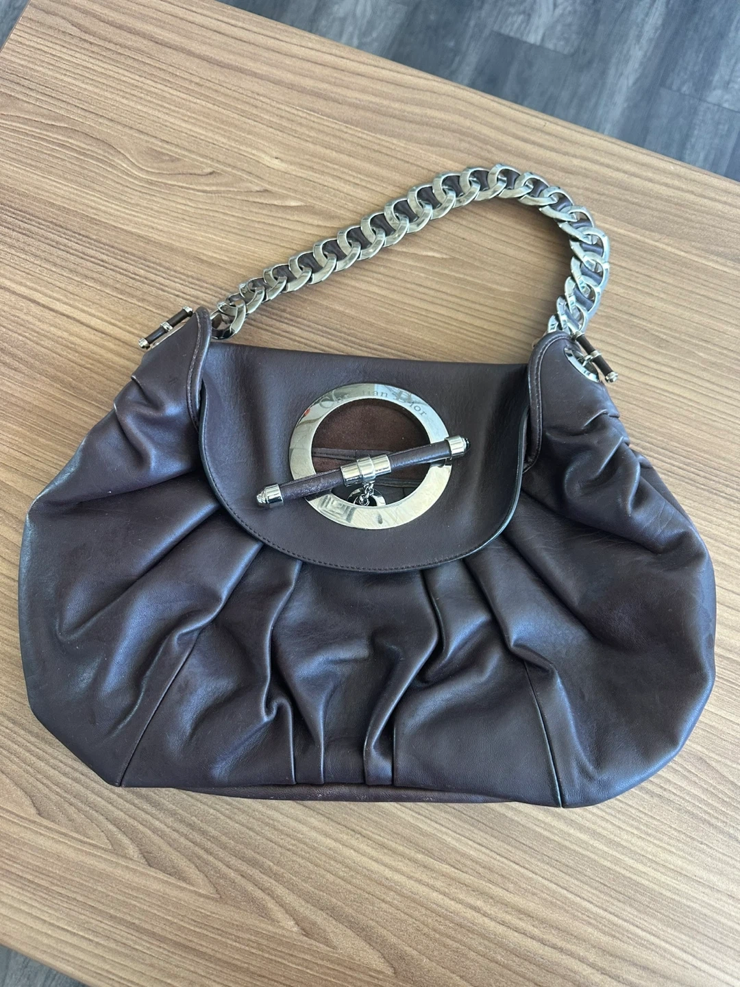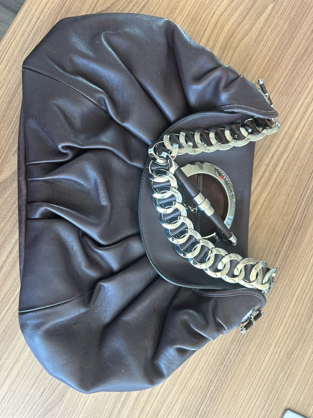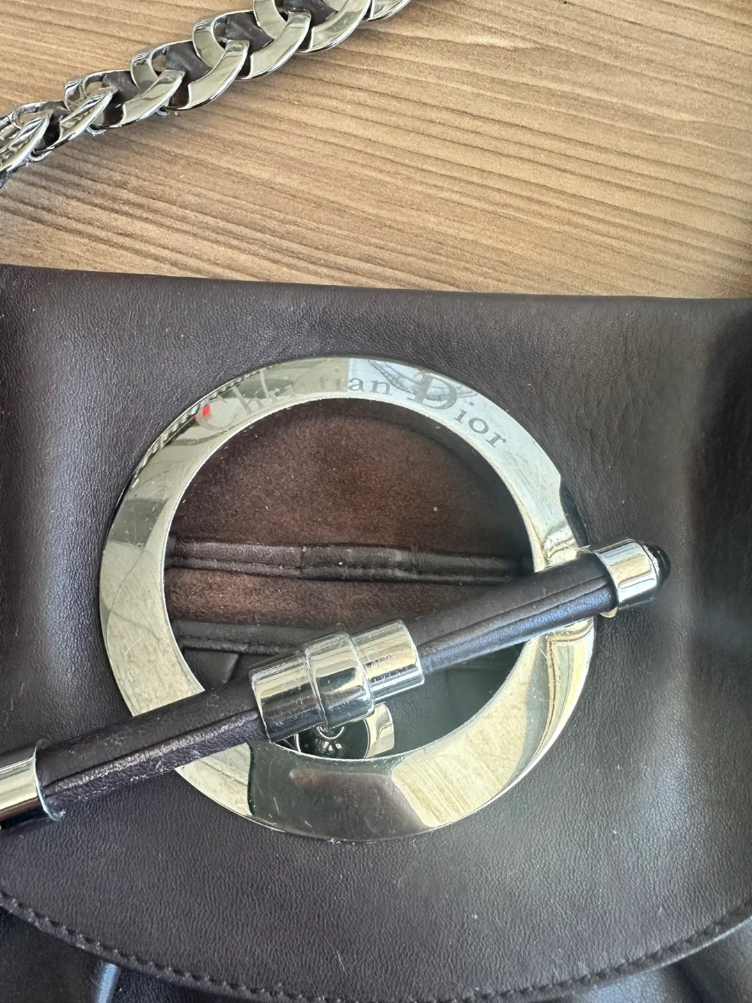 A stylish Christian Dior handbag in rich brown leather. Features a prominent silver-tone chain detail and a circular emblem on the front flap. Made in Italy, it's a classic accessory.
