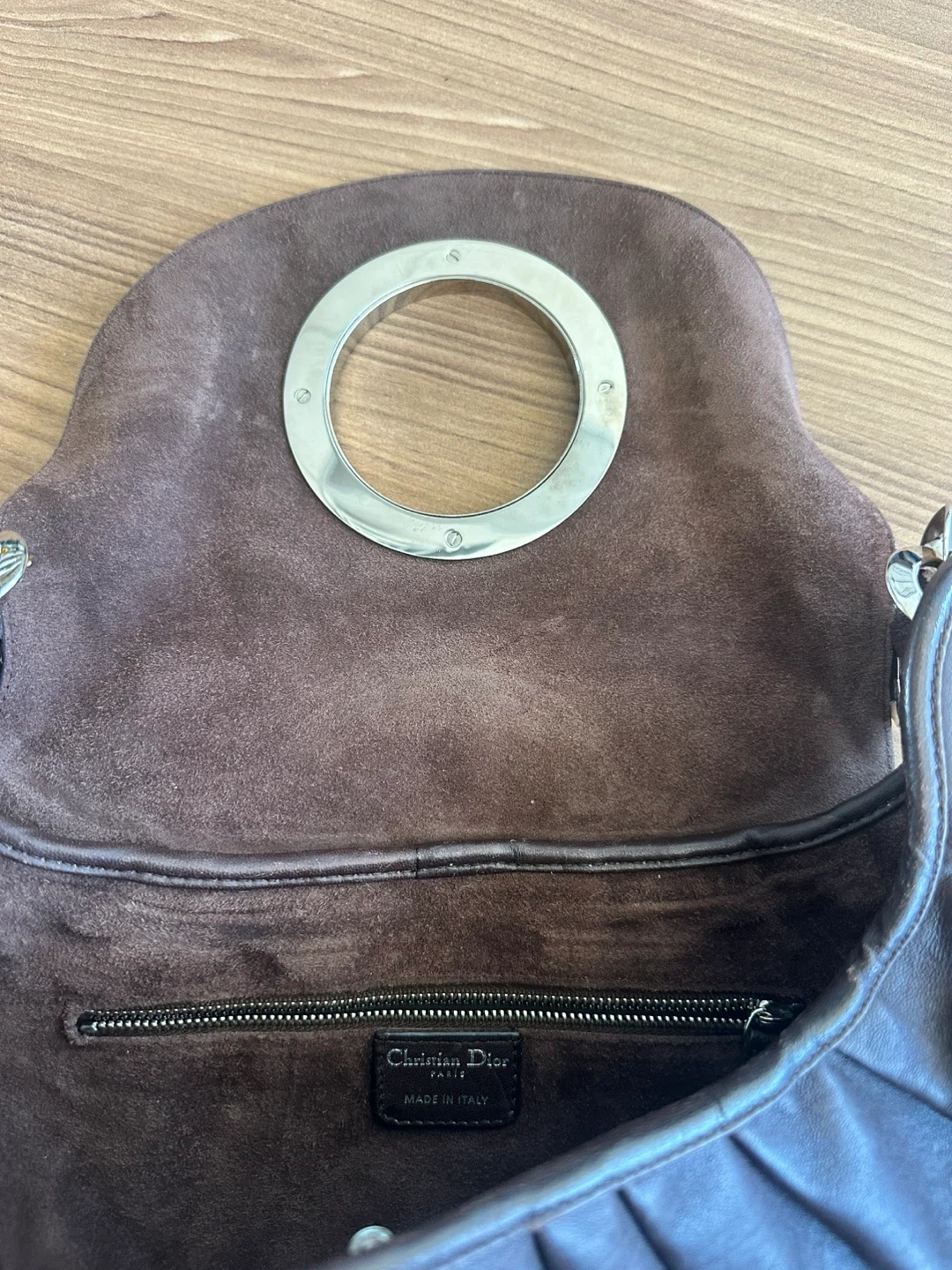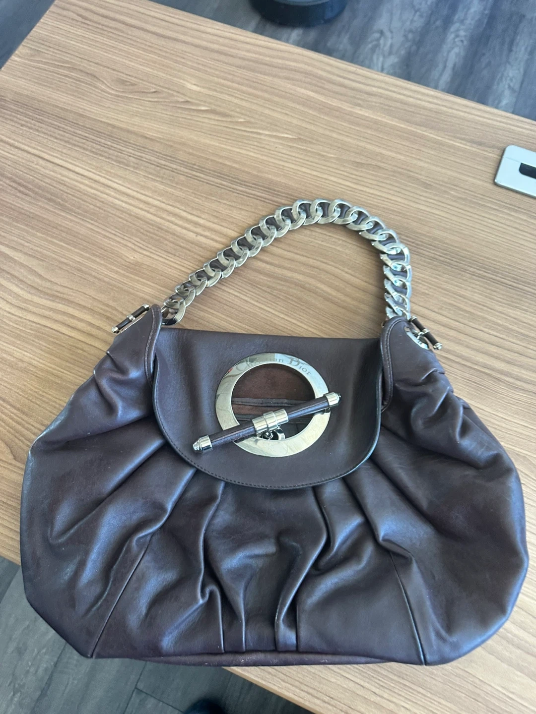 A stylish Christian Dior handbag in rich brown leather. Features a prominent silver-tone chain detail and a circular emblem on the front flap. Made in Italy, it's a classic accessory.