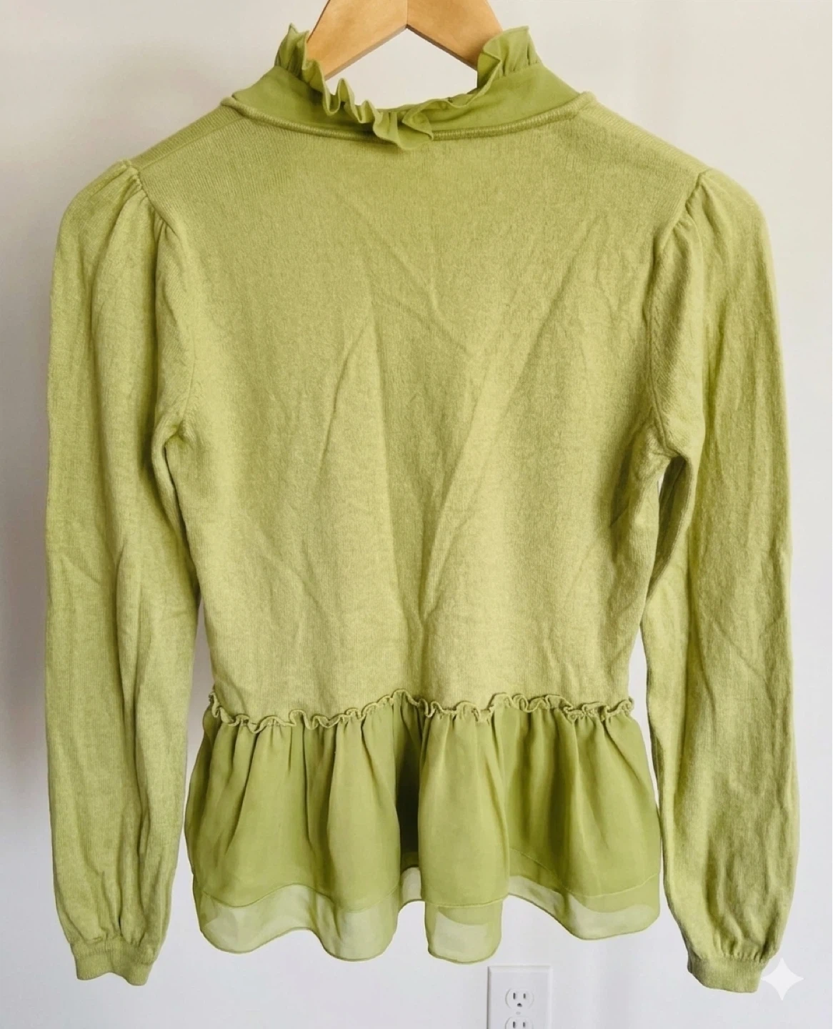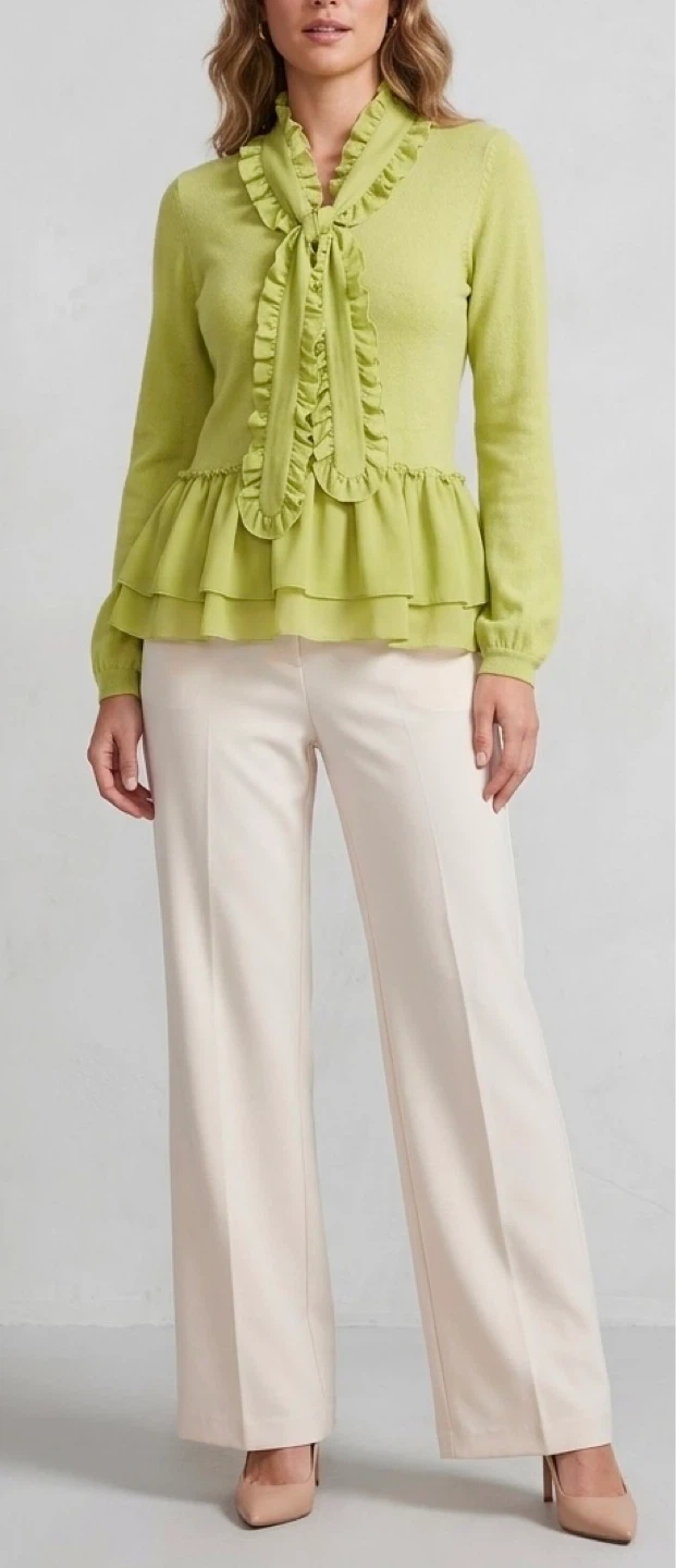This lime green sweater features a ruffled tie-neck and a layered chiffon peplum hem. It's a long-sleeved knit top with delicate ruffled details throughout. The blend of textures gives it a charming, feminine look.