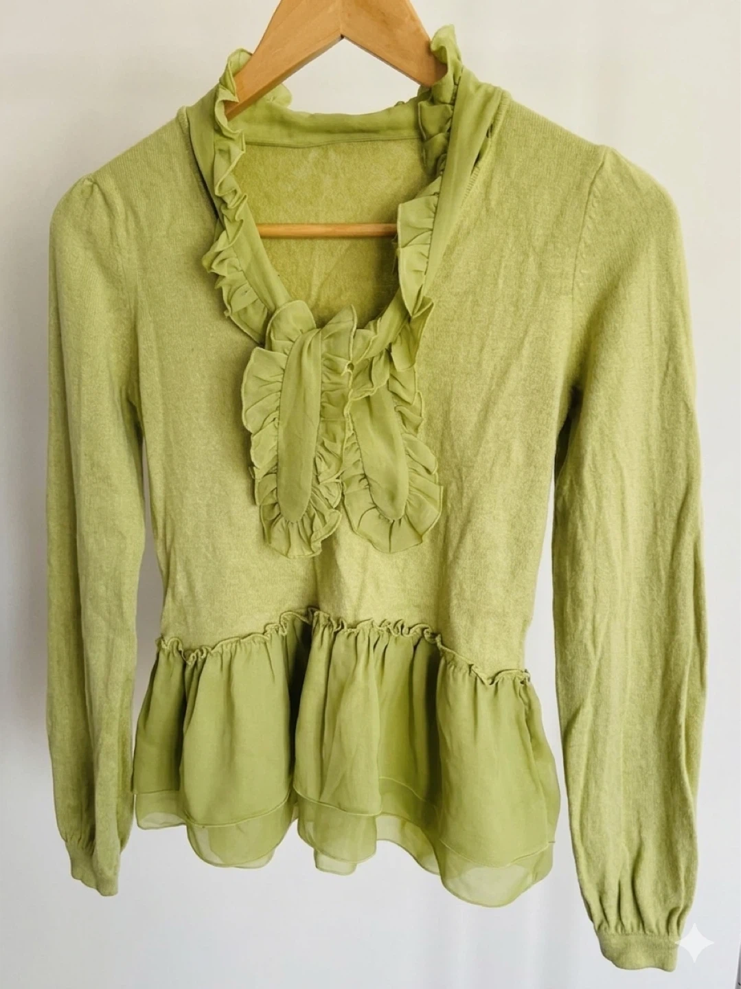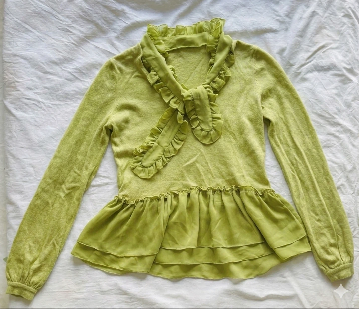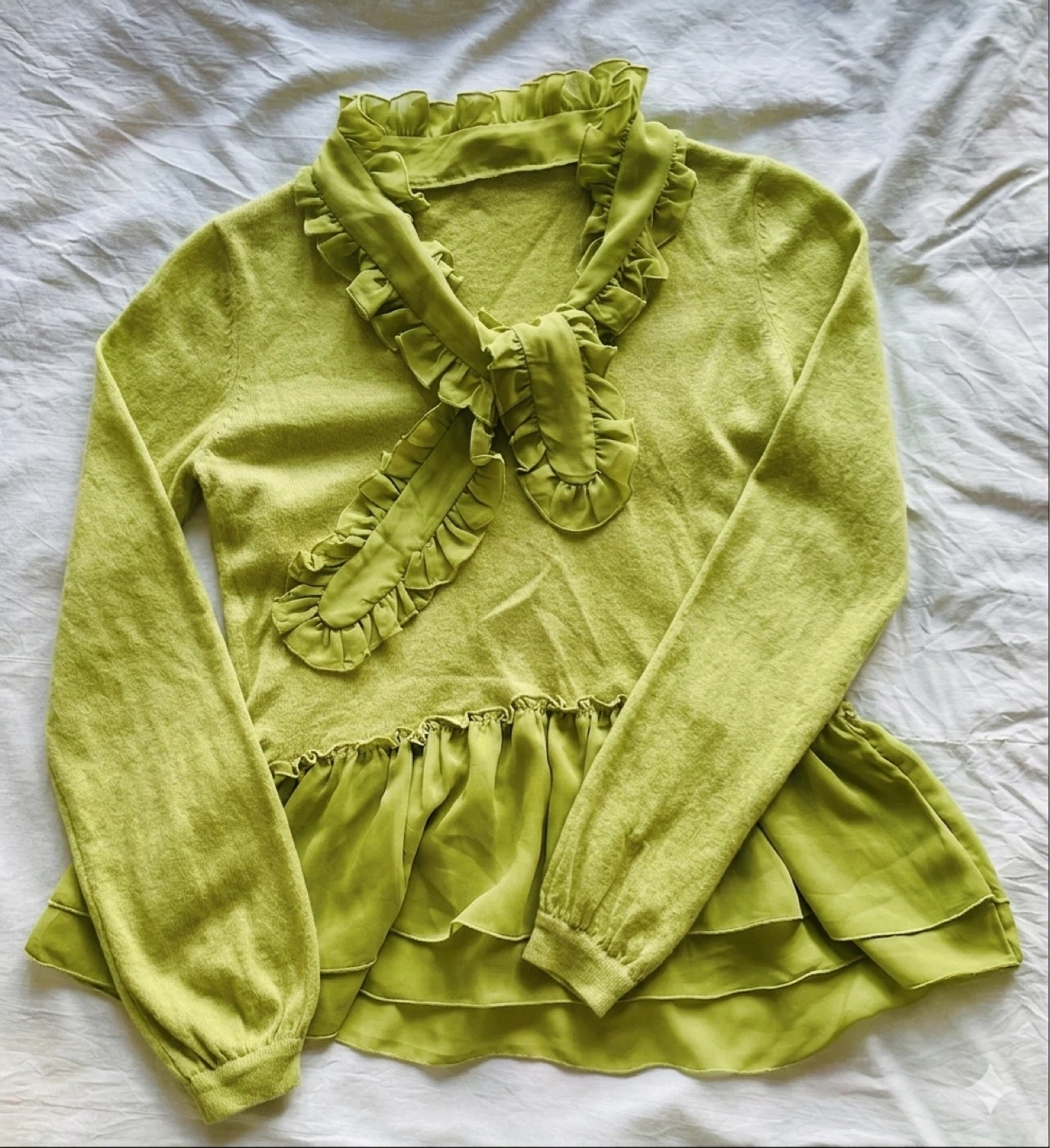 This lime green sweater features a ruffled tie-neck and a layered chiffon peplum hem. It's a long-sleeved knit top with delicate ruffled details throughout. The blend of textures gives it a charming, feminine look.
