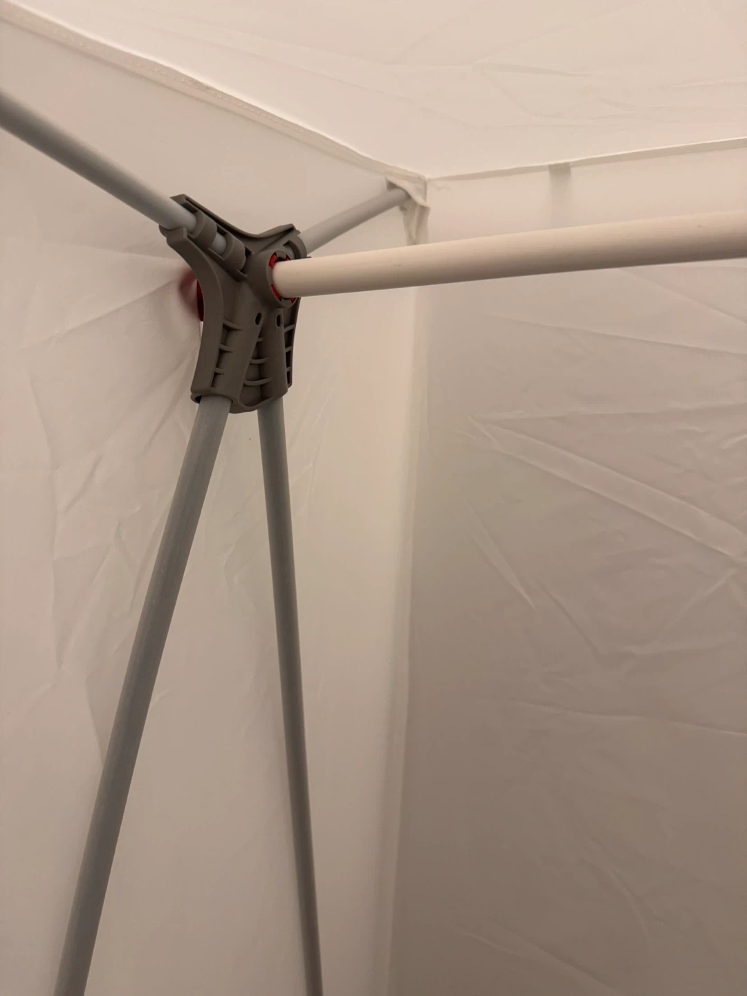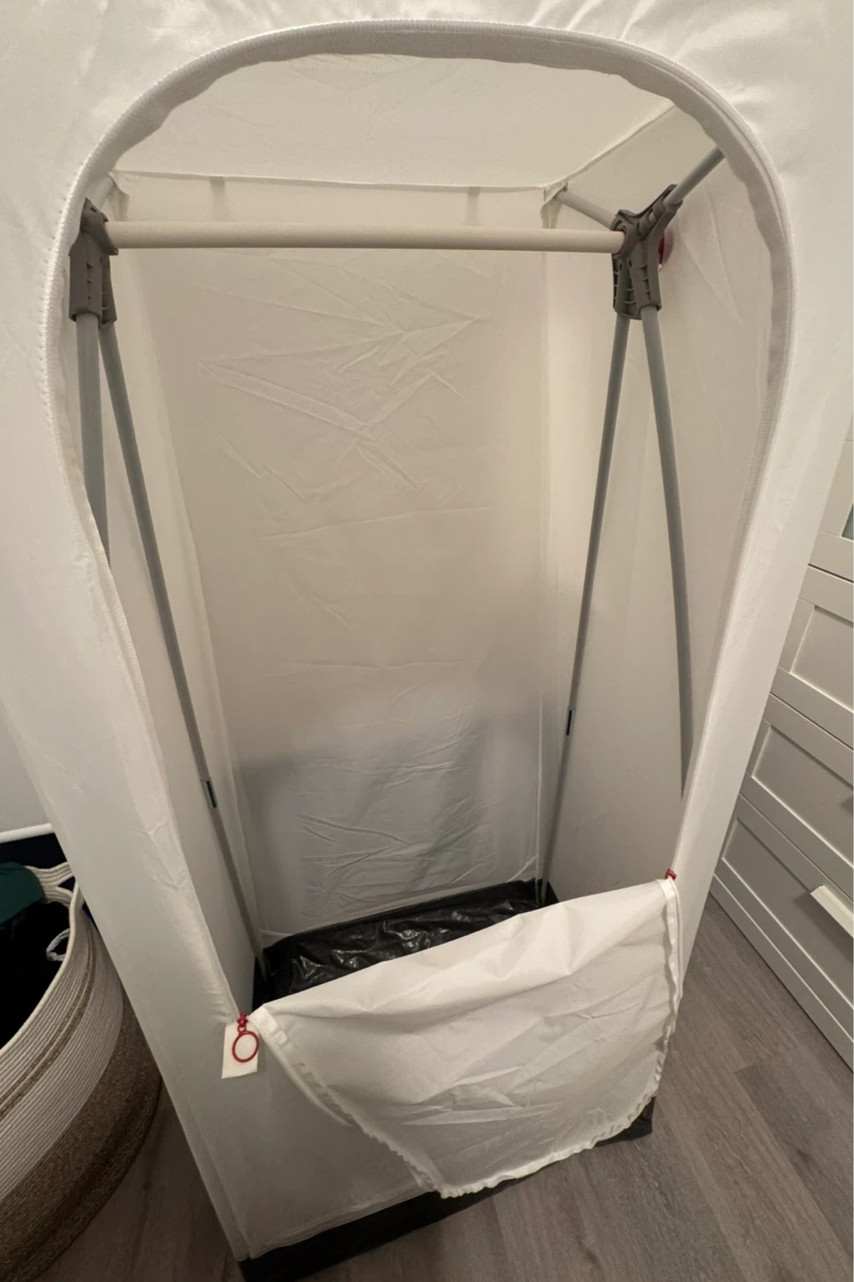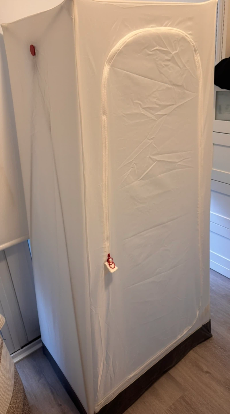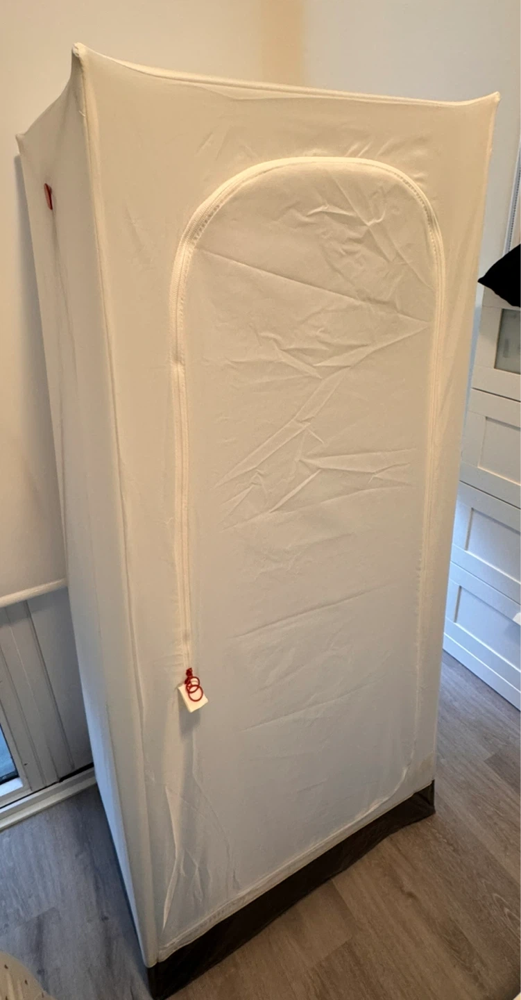 This is a white portable wardrobe. It's made of fabric and has a hanging rod inside. It's easy to set up and move around.