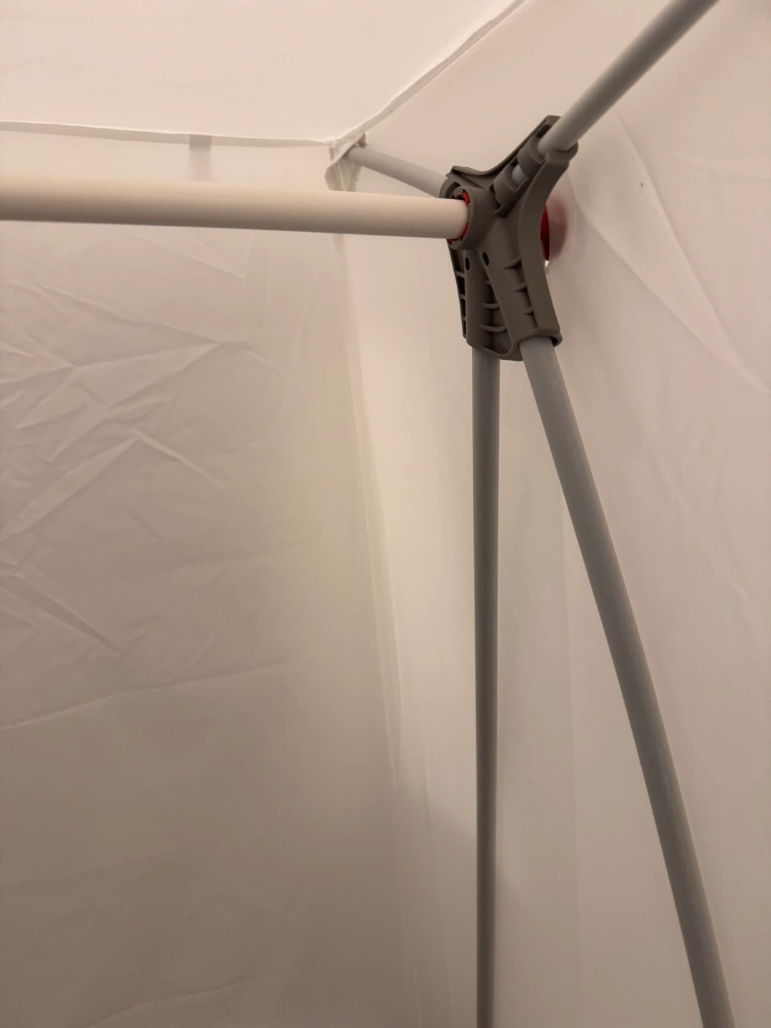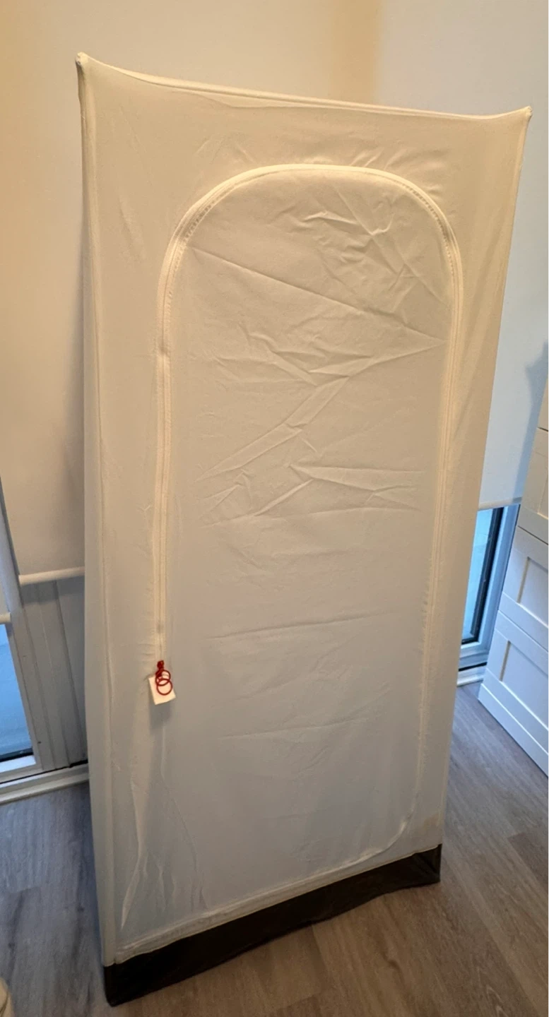 This is a white portable wardrobe. It's made of fabric and has a hanging rod inside. It's easy to set up and move around.