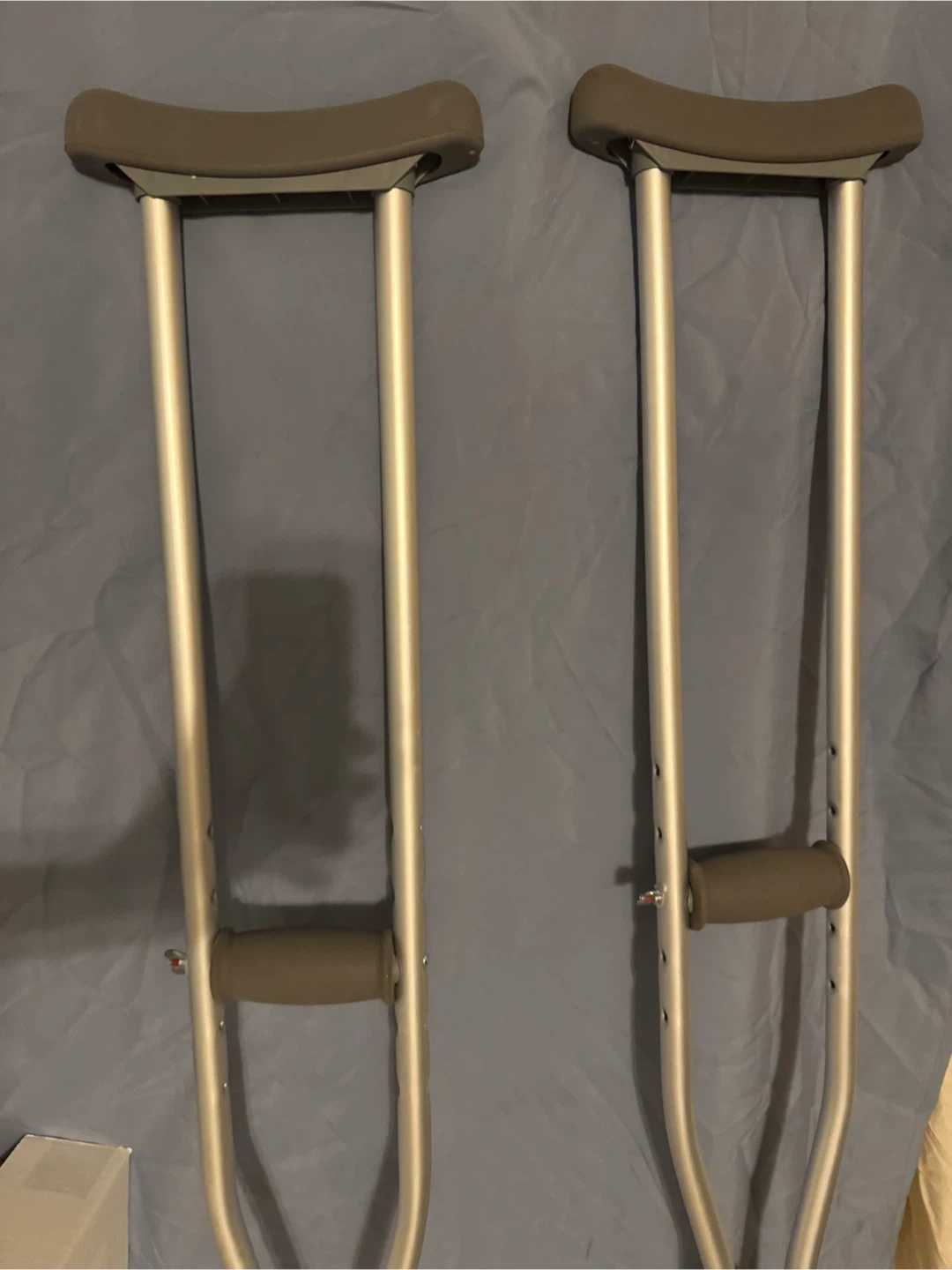 Selling a pair of adjustable aluminum crutches. They feature comfortable padded handgrips and underarm pads. These are essential for mobility support.