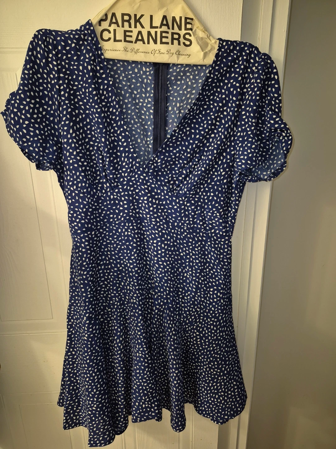 A lovely blue dress with a white speckled pattern. It has a V-neck and short sleeves. Made from a lightweight fabric, it's perfect for warmer weather.. Fit for shorter women (5'2 - 5'6)