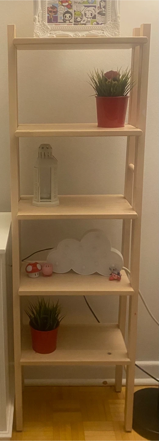 Ladder-style IKEA VILTO shelving unit crafted from fine-grained solid birch with four tiers. Slim footprint makes it ideal for narrow spaces while still offering generous storage.
