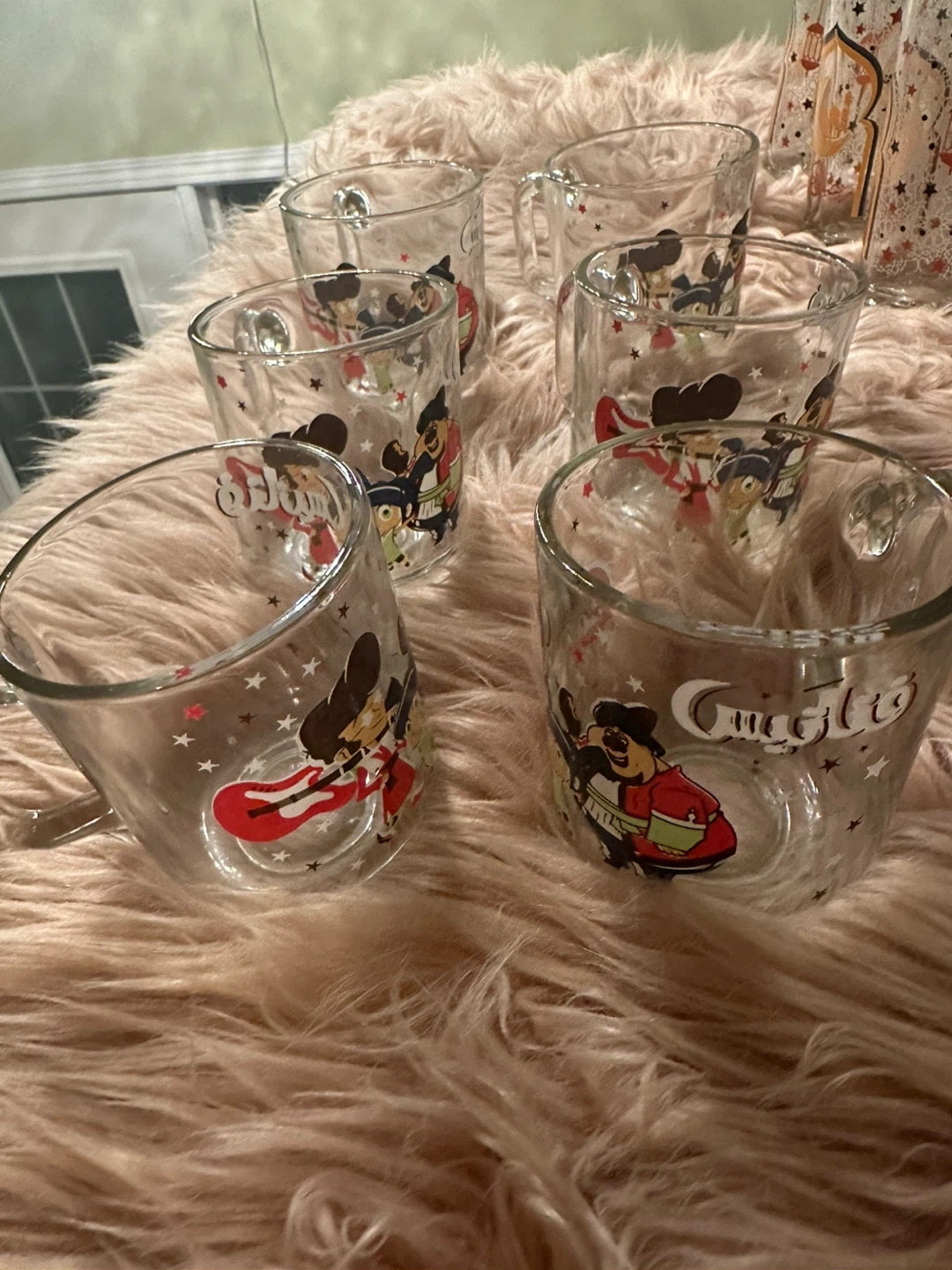 This is a set of six clear glass mugs featuring cartoon characters and stars. Each mug has a handle and clear glass construction. They're perfect for enjoying your morning coffee or tea!