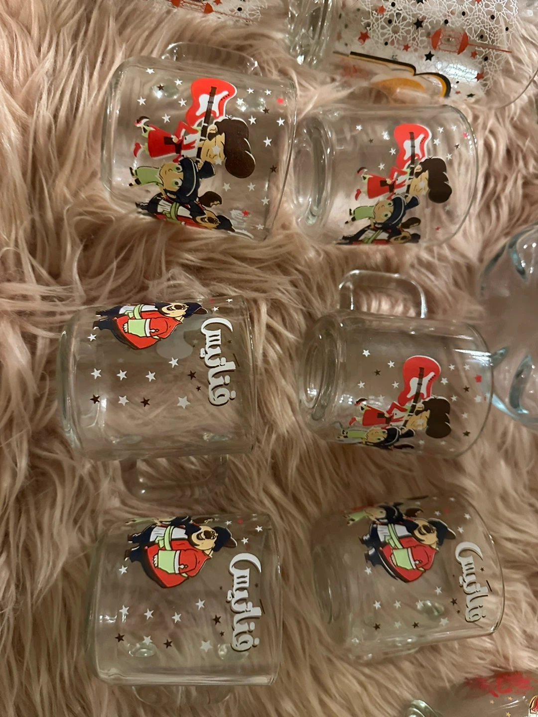 This is a set of six clear glass mugs featuring cartoon characters and stars. Each mug has a handle and clear glass construction. They're perfect for enjoying your morning coffee or tea!