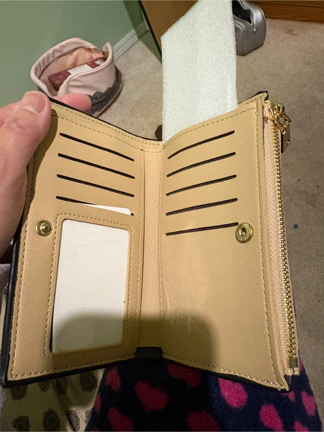Light beige Lululemon card holder. It has multiple card slots and a zippered compartment for coins.