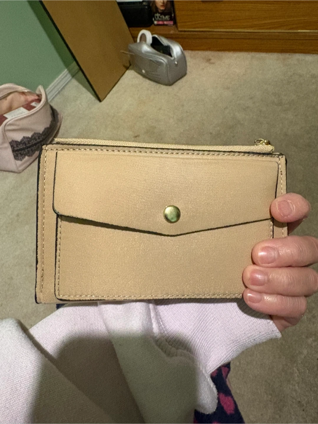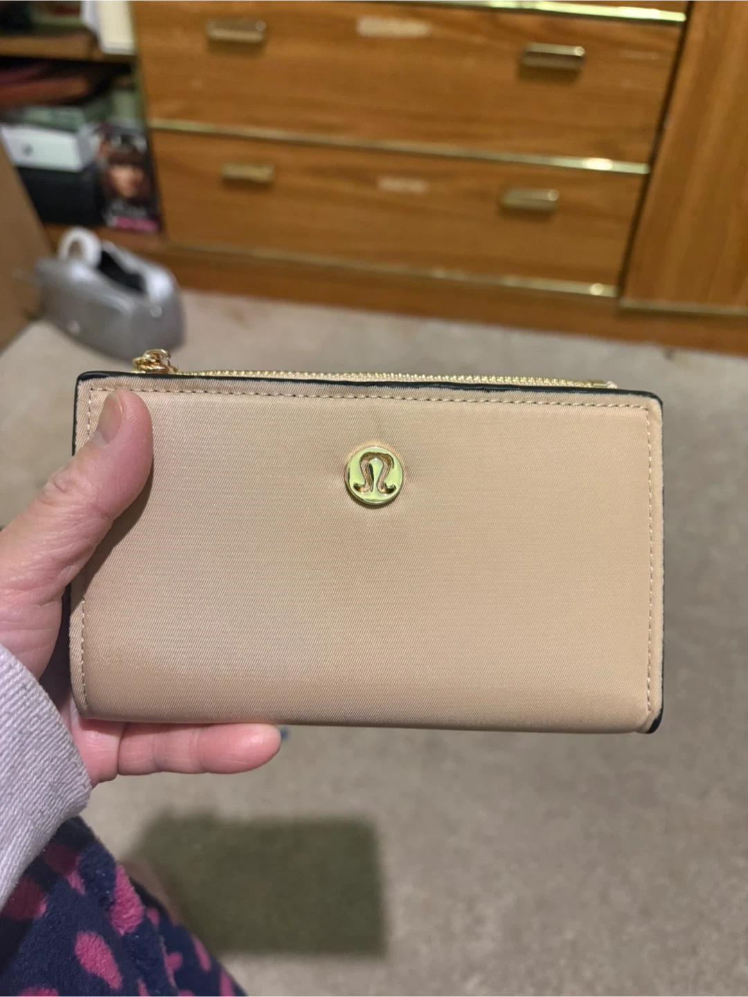 Light beige Lululemon card holder. It has multiple card slots and a zippered compartment for coins.